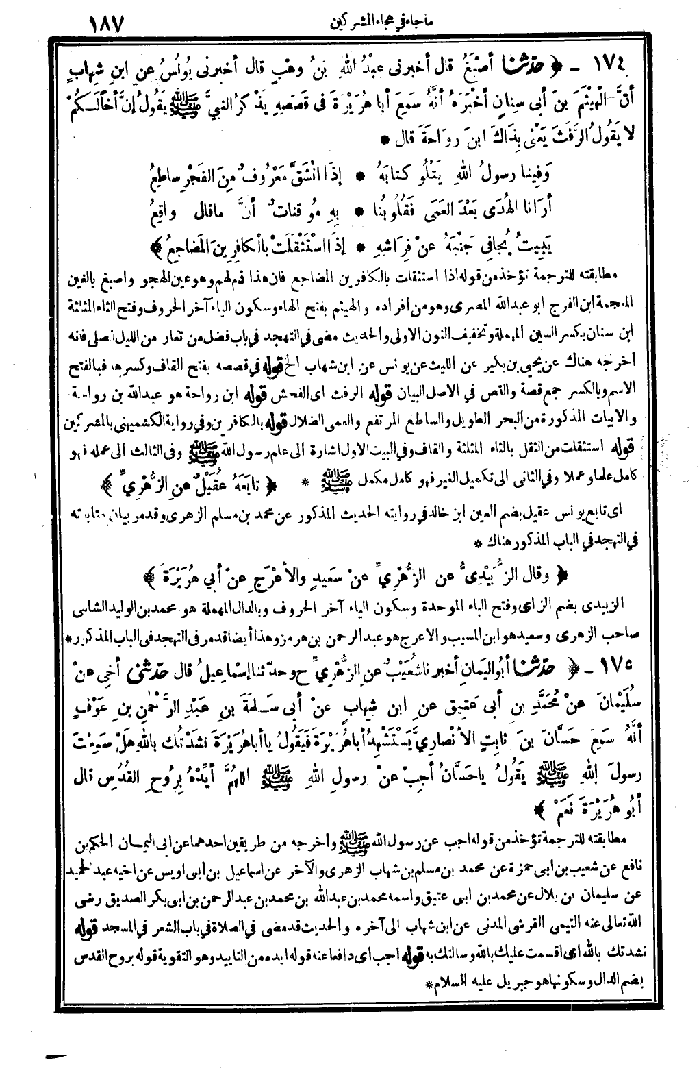 175 - (حَدثنَا أَبُو الْيَمَان أخبرنَا شُعَيْب عَن الزُّهْرِيّ ح وَحدثنَا إِسْمَاعِيل قَالَ حَدثنِي أخي عَن سُلَيْمَان عَن مُحَمَّد بن أبي عَتيق عَن ابْن شهَاب عَن أبي سَلمَة بن عبد الرَّحْمَن بن عَوْف أَنه سمع حسان بن ثَابت الْأنْصَارِيّ يستشهد أَبَا هُرَيْرَة فَيَقُول يَا أَبَا هُرَيْرَة نشدتك بِاللَّه هَل سَمِعت رَسُول الله - صَلَّى اللَّهُ عَلَيْهِ وَسَلَّم َ - يَقُول يَا حسان أجب عَن رَسُول الله - صَلَّى اللَّهُ عَلَيْهِ وَسَلَّم َ - اللَّهُمَّ أيده بِروح الْقُدس قَالَ أَبُو هُرَيْرَة نعم) مطابقته للتَّرْجَمَة تُؤْخَذ من قَوْله أجب عَن رَسُول الله - صَلَّى اللَّهُ عَلَيْهِ وَسَلَّم َ - وَأخرجه من طَرِيقين أَحدهمَا عَن أبي الْيَمَان الحكم بن نَافِع عَن شُعَيْب بن أبي حَمْزَة عَن مُحَمَّد بن مُسلم بن شهَاب الزُّهْرِيّ وَالْآخر عَن إِسْمَاعِيل بن أبي أويس عَن أَخِيه عبد الحميد عَن سُلَيْمَان بن بِلَال عَن مُحَمَّد بن أبي عَتيق واسْمه مُحَمَّد بن عبد الله بن مُحَمَّد بن عبد الرَّحْمَن بن أبي بكر الصّديق رَضِي الله تَعَالَى عَنهُ التَّيْمِيّ الْقرشِي الْمدنِي عَن ابْن شهَاب إِلَى آخِره والْحَدِيث قد مضى فِي الصَّلَاة فِي بَاب الشّعْر فِي الْمَسْجِد قَوْله نشدتك بِاللَّه أَي أَقْسَمت عَلَيْك بِاللَّه وَسَأَلْتُك بِهِ قَوْله أجب أَي دافعا عَنهُ قَوْله أيده من التأييد وَهُوَ التقوية قَوْله بِروح الْقُدس بِضَم الدَّال وسكونها هُوَ جِبْرِيل عَلَيْهِ السَّلَام