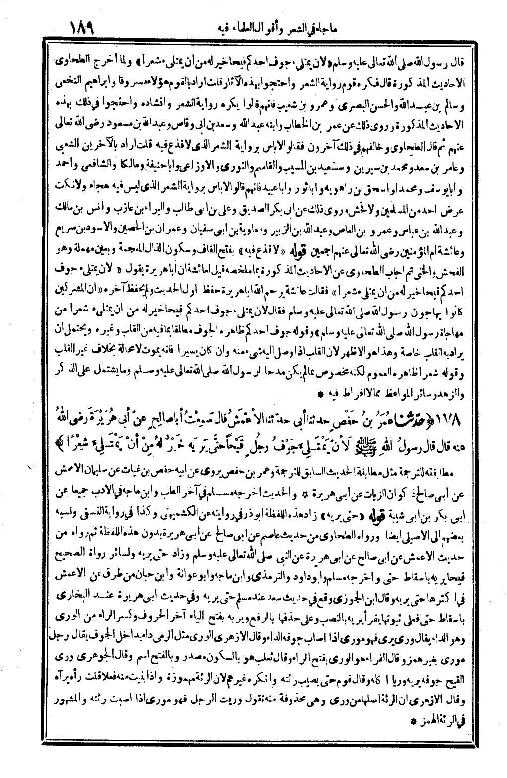قَالَ رَسُول الله صلى الله عَلَيْهِ وَسلم: (لِأَن يمتلىء جَوف أحدكُم قَيْحا خير لَهُ من أَن يمتلىء شعرًا) . وَلما أخرج الطَّحَاوِيّ الْأَحَادِيث الْمَذْكُورَة قَالَ: فكره قوم رِوَايَة الشّعْر وَاحْتَجُّوا بِهَذِهِ الْآثَار. قلت: أَرَادَ بالقوم هَؤُلَاءِ مسروقاً وَإِبْرَاهِيم النَّخعِيّ وَسَالم بن عبد الله وَالْحسن الْبَصْرِيّ وَعَمْرو بن شُعَيْب فَإِنَّهُم قَالُوا: يكره رِوَايَة الشّعْر وإنشاده، وَاحْتَجُّوا فِي ذَلِك بِهَذِهِ الْأَحَادِيث الْمَذْكُورَة، وَرُوِيَ ذَلِك عَن عمر بن الْخطاب وَابْنه عبد الله وَسعد بن أبي وَقاص وَعبد الله بن مَسْعُود رَضِي الله عَنْهُم ثمَّ قَالَ الطَّحَاوِيّ: وَخَالفهُم فِي ذَلِك آخَرُونَ، فَقَالُوا: لَا بَأْس بِرِوَايَة الشّعْر الَّذِي لَا قذع فِيهِ. قلت: أَرَادَ بالآخرين: الشّعبِيّ وعامر بن سعد وَمُحَمّد بن سِيرِين وَسَعِيد بن الْمسيب وَالقَاسِم والقوري وَالْأَوْزَاعِيّ وَأَبا حنيفَة ومالكاً وَالشَّافِعِيّ وَأحمد وَأَبا يُوسُف ومحمداً وَإِسْحَاق بن رَاهَوَيْه وَأَبا ثَوْر وَأَبا عبيد، فأنهم قَالُوا: لَا بَأْس بِرِوَايَة الشّعْر الَّذِي لَيْسَ فِيهِ هجاء وَلَا نكت عرض أحد من الْمُسلمين وَلَا فحش، وَرُوِيَ ذَلِك عَن أبي بكر الصّديق وَعلي بن أبي طَالب والبراء بن عَازِب وَأنس بن مَالك وَعبد الله بن عَبَّاس وَعَمْرو بن الْعَاصِ وَعبد الله بن الزبير وَمُعَاوِيَة بن أبي سُفْيَان وَعمْرَان بن الْحصين وَالْأسود بن سريع وَعَائِشَة أم الْمُؤمنِينَ رَضِي الله عَنْهُم أَجْمَعِينَ. قَوْله: (لَا قذع فِيهِ) ، بِفَتْح الْقَاف وَسُكُون الذَّال الْمُعْجَمَة وبعين مُهْملَة وَهُوَ الْفُحْش والخنى، ثمَّ أجَاب الطَّحَاوِيّ عَن الْأَحَادِيث الْمَذْكُورَة بِمَا ملخصه، قيل لعَائِشَة: إِن أَبَا هُرَيْرَة يَقُول: (لِأَن يمتلىء جَوف أحدكُم قَيْحا خير لَهُ من أَن يمتلىء مشعراً) ، فَقَالَت عَائِشَة: يرْجم الله أَبَا هُرَيْرَة، حفظ أول الحَدِيث وَلم يحفظ آخِره: (إِن الْمُشْركين كَانُوا يَهْجُونَ رَسُول الله صلى الله عَلَيْهِ وَسلم، فَقَالَ: لِأَن يمتلىء جَوف أحدكُم قَيْحا خير لَهُ من أَن يمتلىء شعرًا من مهاجاة رَسُول الله صلى الله عَلَيْهِ وَسلم) . وَقَوله: (جَوف أحدكُم) ظَاهره الْجوف مُطلقًا بِمَا فِيهِ من الْقلب وَغَيره وَيحْتَمل أَن يُرَاد الْقلب خَاصَّة، وَهَذَا هُوَ الْأَظْهر لِأَن الْقلب إِذا وصل إِلَيْهِ شَيْء مِنْهُ وَإِن كَانَ يَسِيرا فَإِنَّهُ يَمُوت لَا محَالة بِخِلَاف غير الْقلب. وَقَوله: (شعرًا) ظَاهره الْعُمُوم لكنه مَخْصُوص بِمَا لم يكن مدحاً لرَسُول الله صلى الله عَلَيْهِ وَسلم، وَمَا يشْتَمل على الذّكر والزهد وَسَائِر المواعظ مِمَّا لَا إفراط فِيهِ.
