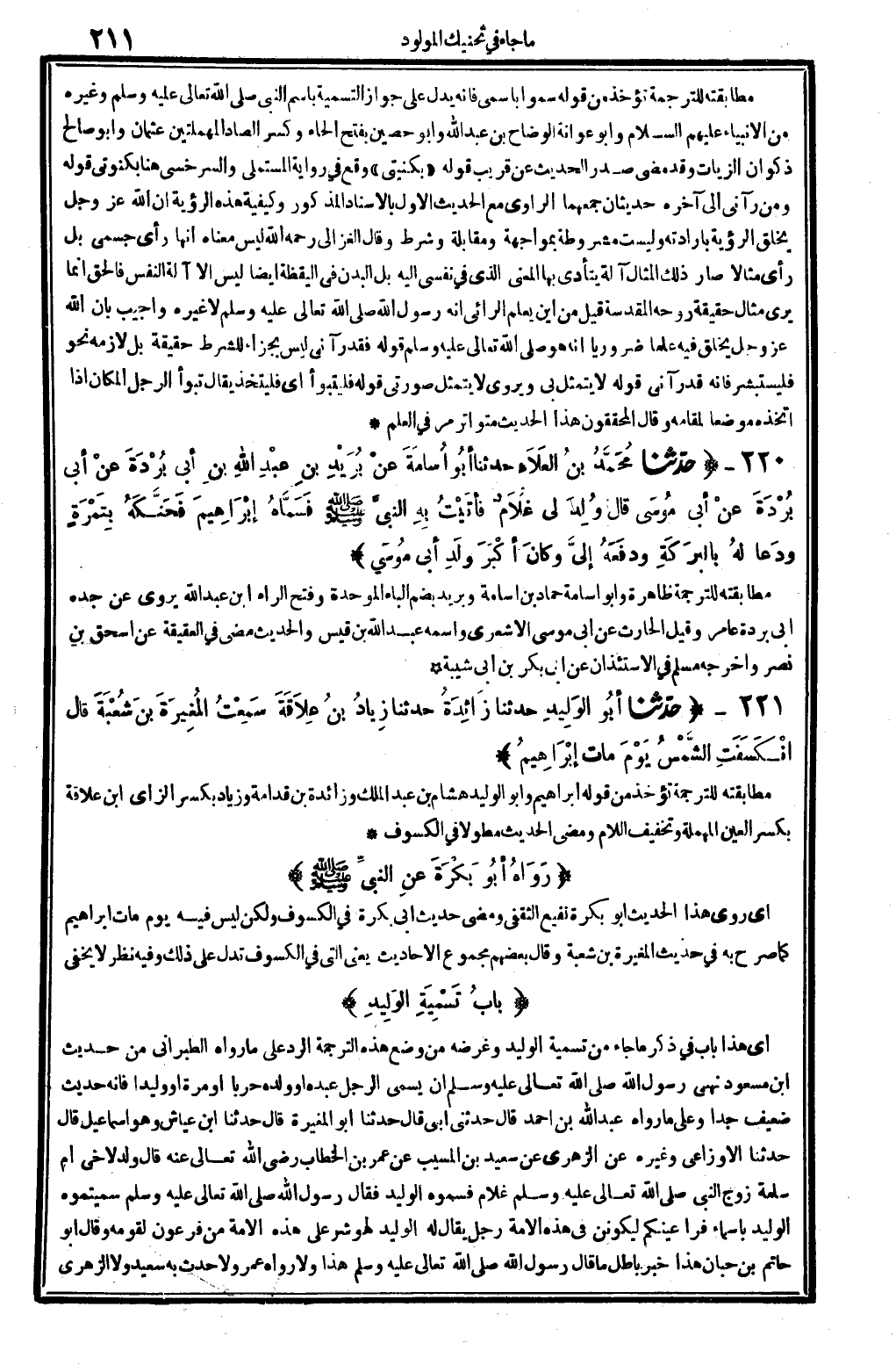6198 - حدَّثنا مُحَمَّدُ بنُ العَلاَءِ حَدثنَا أبُو أسامَة عَنْ بُرَيْدِ بنِ عَبْدِ الله بنِ أبي بُرْدَةَ عَنْ أبي بُرْدَةَ عَنْ أبي مُوسَى، قَالَ: وُلِدَ لي غُلاَمٌ فأتَيْتُ بِهِ النبيَّ صلى الله عَلَيْهِ وَسلم فَسَمَّاهُ إبْرَاهِيمَ فَحَنَّكَةُ بِتَمْرَةٍ ودَعا لَهُ بالبَرَكَةِ ودَفَعَهُ إليَّ وكانَ أكْبَرَ وَلَدِ أبي مُوسَى. (انْظُر الحَدِيث 5467) .