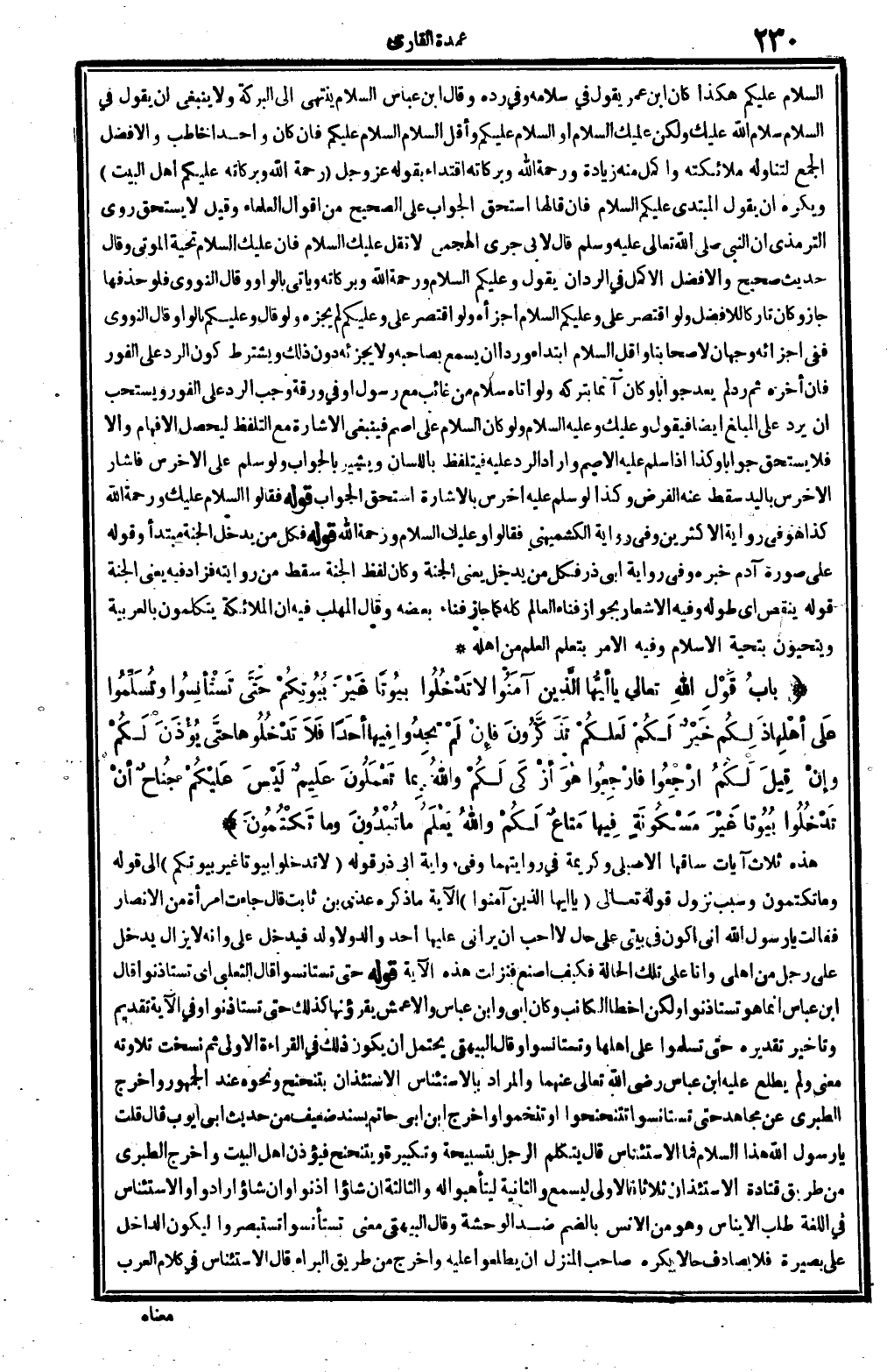 هَذِه ثَلَاث آيَات سَاقهَا الْأصيلِيّ وكريمة فِي روايتهما، وَفِي رِوَايَة أبي ذَر قَوْله: {لَا تدْخلُوا بُيُوتًا غير بُيُوتكُمْ} إِلَى قَوْله: {وَمَا تكتمون} وَسبب نزُول قَوْله تَعَالَى: {اأيها الَّذين آمنُوا} ... الْآيَة. مَا ذكره عدي بن ثَابت، قَالَ: جَاءَت امْرَأَة من الْأَنْصَار فَقَالَت: يَا رَسُول الله {إِنِّي أكون فِي بَيْتِي على حَال لَا أحب أَن يراني عَلَيْهَا أحد والدولا ولد فَيدْخل عَليّ، وَإنَّهُ لَا يزَال يدْخل عَليّ رجل من أَهلِي وَأَنا على تِلْكَ الْحَالة، فَكيف أصنع؟ فَنزلت هَذِه الْآيَة. قَوْله: (حَتَّى تستأنسوا) قَالَ الثَّعْلَبِيّ: أَي: تستأذنوا. قَالَ ابْن عَبَّاس: إِنَّمَا هُوَ تستأذنوا، وَلَكِن أَخطَأ الْكَاتِب، وَكَانَ أبي وَابْن عَبَّاس وَالْأَعْمَش يقرؤونها كَذَلِك: حَتَّى تستأذنوا، وَفِي الْآيَة تَقْدِيم وَتَأْخِير تَقْدِيره: حَتَّى تسلموا على أَهلهَا وتستأنسوا، وَقَالَ الْبَيْهَقِيّ: يحْتَمل أَن يكون ذَلِك فِي الْقِرَاءَة الأولى ثمَّ نسخت تِلَاوَته معنى، وَلم يطلع عَلَيْهِ ابْن عَبَّاس رَضِي الله عَنْهُمَا. وَالْمرَاد بالاستئناس الاسْتِئْذَان بتنحنح وَنَحْوه عِنْد الْجُمْهُور. وَأخرج الطَّبَرِيّ عَن مُجَاهِد: حَتَّى تستأنسوا: تتنحنحوا أَو تنخموا، وَأخرج ابْن أبي حَاتِم بِسَنَد ضَعِيف من حَدِيث أبي أَيُّوب قَالَ: قلت: يَا رَسُول الله} هَذَا السَّلَام فَمَا الِاسْتِئْنَاس؟ قَالَ: يتَكَلَّم الرجل بتسبيحة وَتَكْبِيرَة وَيَتَنَحْنَح فَيُؤذن أهل الْبَيْت. وَأخرج الطَّبَرِيّ من طَرِيق قَتَادَة. الاسْتِئْذَان ثَلَاثًا، فَالْأولى ليسمع، وَالثَّانيَِة لِيَتَأَهَّبُوا لَهُ، وَالثَّالِثَة أَن شاؤوا أذنوا وَإِن شاؤوا أَرَادوا. والاستئناس فِي اللُّغَة طَالب الإيناس وَهُوَ من الْأنس بِالضَّمِّ ضد الوحشة، وَقَالَ الْبَيْهَقِيّ: معنى: تستأنسوا، تستبصروا ليَكُون الدَّاخِل على بَصِيرَة فَلَا يُصَادف مَا لَا يكره صَاحب الْمنزل أَن يطلعوا عَلَيْهِ. وَأخرج من طَرِيق الْبَراء، قَالَ: الِاسْتِئْنَاس فِي كَلَام الْعَرَب
