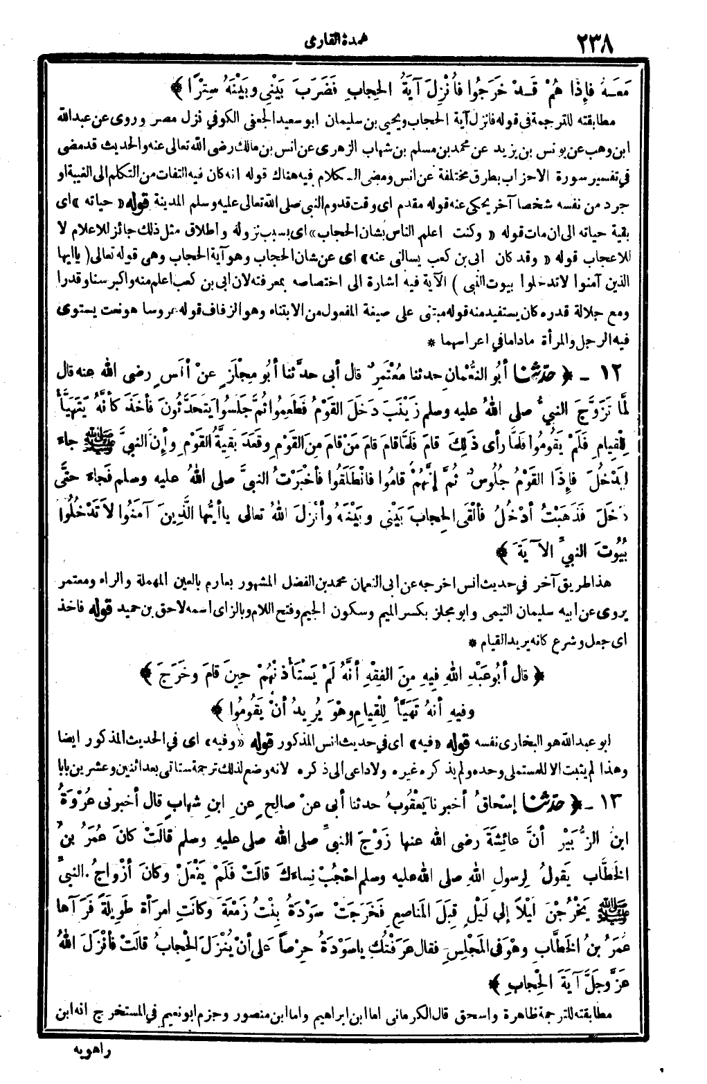 13 - (حَدثنَا إِسْحَاق أخبرنَا يَعْقُوب حَدثنَا أبي عَن صَالح عَن ابْن شهَاب قَالَ أَخْبرنِي عُرْوَة بن الزبير أَن عَائِشَة رَضِي الله عَنْهَا زوج النَّبِي - صَلَّى اللَّهُ عَلَيْهِ وَسَلَّم َ - قَالَت كَانَ عمر بن الْخطاب يَقُول لرَسُول الله - صَلَّى اللَّهُ عَلَيْهِ وَسَلَّم َ - احجب نِسَاءَك قَالَت فَلم يفعل وَكَانَ أَزوَاج النَّبِي - صَلَّى اللَّهُ عَلَيْهِ وَسَلَّم َ - يخْرجن لَيْلًا إِلَى ليل قبل المناصع فَخرجت سَوْدَة بنت زَمعَة وَكَانَت امْرَأَة طَوِيلَة فرآها عمر بن الْخطاب وَهُوَ فِي الْمجْلس فَقَالَ عرفتك يَا سَوْدَة حرصا على أَن ينزل الْحجاب قَالَت فَأنْزل الله عز وَجل آيَة الْحجاب) مطابقته للتَّرْجَمَة ظَاهِرَة وَإِسْحَق قَالَ الْكرْمَانِي إِمَّا ابْن إِبْرَاهِيم وَإِمَّا ابْن مَنْصُور وَجزم أَبُو نعيم فِي الْمُسْتَخْرج أَنه ابْن