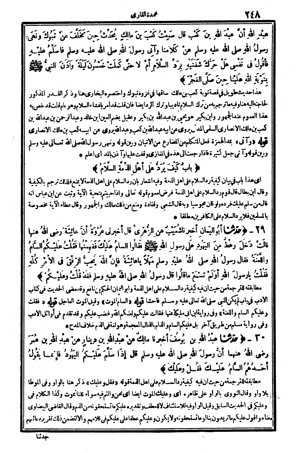 عبدِ الله أنَّ عَبْدَ الله بنَ كَعْب قَالَ: سَمِعْتُ كَعْبَ بنَ مالِكٍ يُحَدِّثُ حِينَ تَخَلَّفَ عَنْ تَبُوكَ وَنَهاى رسولُ الله صلى الله عَلَيْهِ وَسلم، عَنْ كَلاَمَنا، وآتِي رسولَ الله صلى الله عَلَيْهِ وَسلم، فأسَلِّمُ عَلَيْهِ فأقُولُ فِي نَفْسِي: هَلْ حَرَّكَ شَفَتَيْهِ بِرَدِّ السَّلاَمِ أمْ؟ لَا حَتَّى كَملَتْ خَمْسُونَ لَيْلَةَ، وآذَنَ النبِيُّ صلى الله عَلَيْهِ وَسلم بِتَوْبَةِ الله عَلَيْنا حِينَ صَلَّى الفَجْرَ.