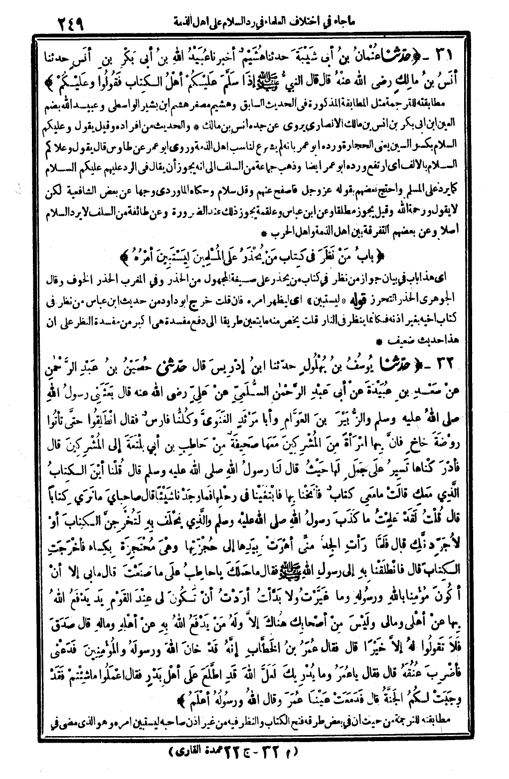 والْحَدِيث من أَفْرَاده. وَقيل: يَقُول: (وَعَلَيْكُم السَّلَام) بِكَسْر السِّين يَعْنِي الْحِجَارَة، ورده أَبُو عمر بِأَنَّهُ لم يشرع لنا سبُّ أهل الذِّمَّة، وروى أَبُو عمر عَن طَاوُوس قَالَ: يَقُول: (وعلاكم السَّلَام) بِالْألف أَي: ارْتَفع، ورده أَبُو عمر أَيْضا، وَذهب جمَاعَة من السّلف إِلَى أَنه يجوز أَن يُقَال فِي الرَّد عَلَيْهِم: عَلَيْكُم السَّلَام، كَمَا يرد على الْمُسلم، وَاحْتج بَعضهم بقوله عز وَجل: {فاصفح عَنْهُم وَقل سَلام} (الزخرف: 89) وَحَكَاهُ الْمَاوَرْدِيّ وَجها عَن بعض الشَّافِعِيَّة، لَكِن لَا يَقُول: (وَرَحْمَة الله) وَقيل: يجوز مُطلقًا، وَعَن ابْن عَبَّاس وعلقمة يجوز ذَلِك عِنْد الضَّرُورَة، وَعَن طَائِفَة من السّلف: لَا يرد السَّلَام أصلا، وَعَن بَعضهم: التَّفْرِقَة بَين أهل الذِّمَّة وَأهل الْحَرْب.