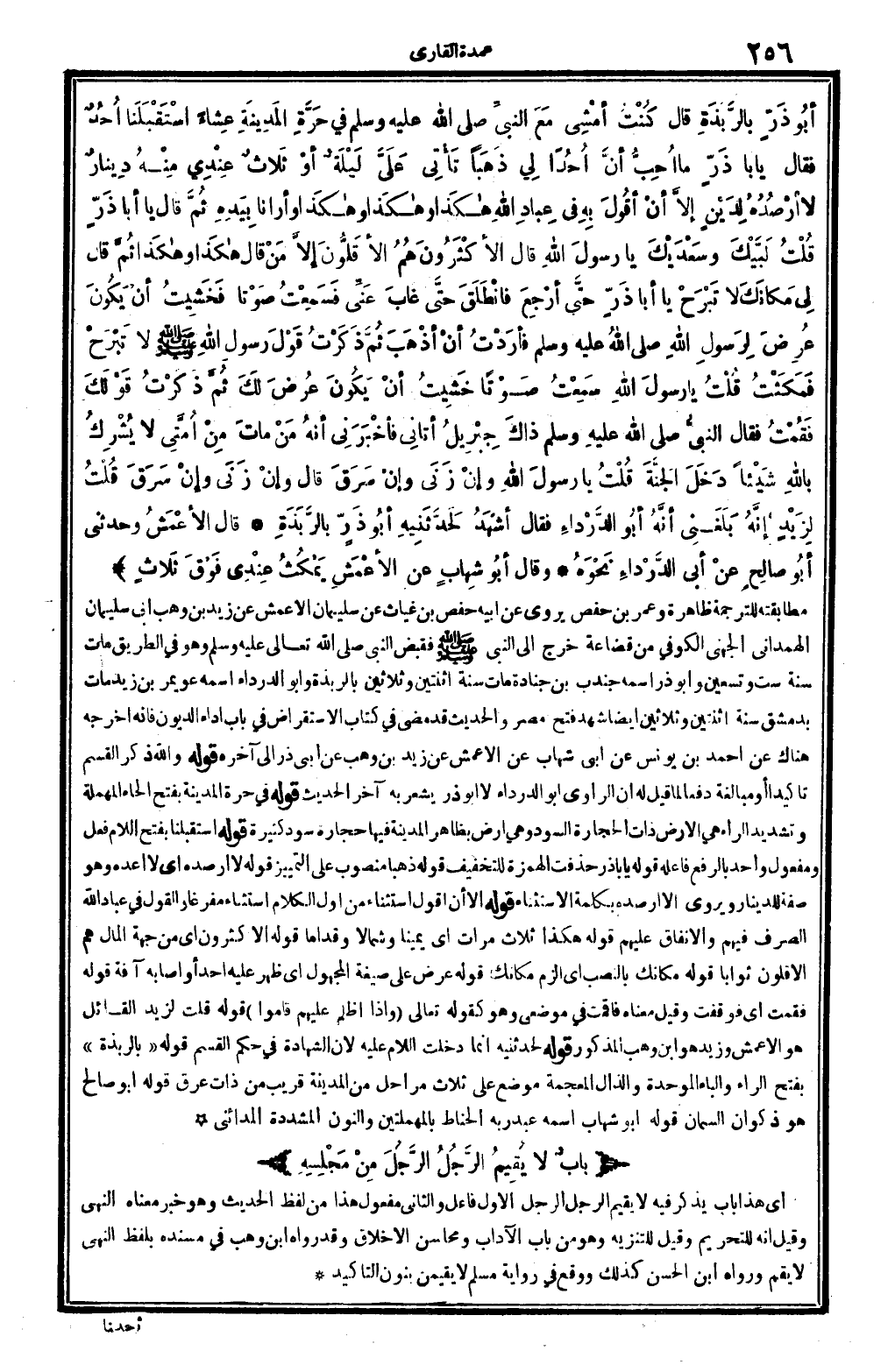 قَوْله: (وَالله) ذكر الْقسم تَأْكِيدًا أَو مُبَالغَة دفعا لما قيل لَهُ: إِن الرَّاوِي أَبُو الدَّرْدَاء لَا أَبُو ذَر، يشْعر بِهِ آخر الحَدِيث. قَوْله: (فِي حرَّة الْمَدِينَة) بِفَتْح الْحَاء الْمُهْملَة وَتَشْديد الرَّاء هِيَ الأَرْض ذَات الْحِجَارَة السود وَهِي أَرض بِظَاهِر الْمَدِينَة فِيهَا حِجَارَة سود كَثِيرَة. قَوْله: (استقبلنا) بِفَتْح اللَّام فعل ومفعول وَاحِد بِالرَّفْع فَاعله. قَوْله: (يَا با ذَر) حذفت الْهمزَة للتَّخْفِيف. قَوْله: (ذَهَبا) مَنْصُوب على التَّمْيِيز. قَوْله: (لَا أرصدة) أَي: لَا أعده وَهُوَ صفة للدينار، ويروى: إلاَّ أرصدة، بِكَلِمَة الِاسْتِثْنَاء. قَوْله: (إلاَّ أَن أَقُول) اسْتثِْنَاء من أول الْكَلَام استثنار مفرغاً وَالْقَوْل فِي عباد الله الصّرْف فيهم والإنفاق عَلَيْهِم. قَوْله: (هَكَذَا، ثَلَاث مَرَّات) أَي: يَمِينا وَشمَالًا وقداماً. قَوْله: (الْأَكْثَرُونَ) أَي: من جِهَة المَال (هم الأقلون) ثَوابًا. قَوْله: (مَكَانك) بِالنّصب أَي: إلزم مَكَانك، قَوْله: (عرض) على صِيغَة الْمَجْهُول أَي: ظهر عَلَيْهِ أحد أَو أَصَابَهُ آفَة. قَوْله: (فَقُمْت) أَي: فوقفت، وَقيل: مَعْنَاهُ فأقمت فِي موضعي وَهُوَ كَقَوْلِه تَعَالَى: { (2) وَإِذا أظلم عَلَيْهِم قَامُوا} (الْبَقَرَة: 20) [/ ح.