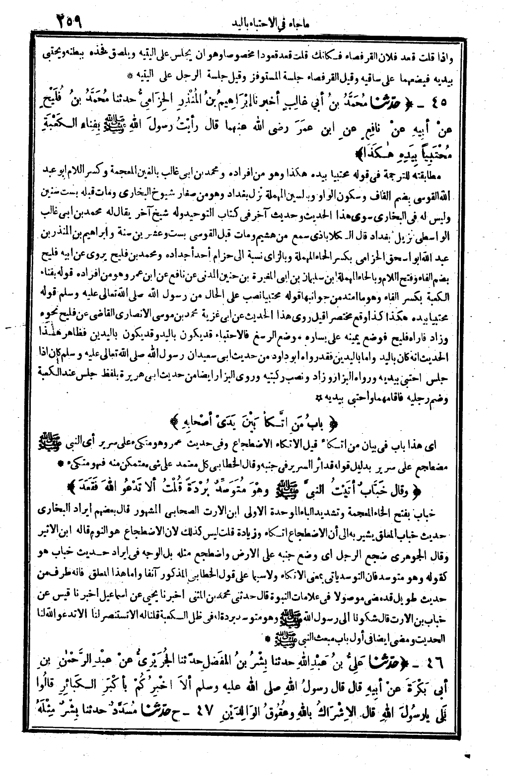6272 - حدَّثنا مُحَمَّدُ بنُ أبي غالِبٍ أخبرنَا إبْرَاهِيمُ بنُ المُنْذِرِ الحِزَامِيُّ حَدثنَا مُحَمَّدُ بنُ فُلَيْحٍ عَنْ أبِيهِ عَنْ نافِعٍ عَنِ ابْن عمَرَ رَضِي الله عَنْهُمَا قَالَ: رأيْتُ رسولَ الله صلى الله عَلَيْهِ وَسلم بِفِنَاءِ الكَعْبَةِ مُحْتَبِياً بِيَدِهِ هاكَذَا.