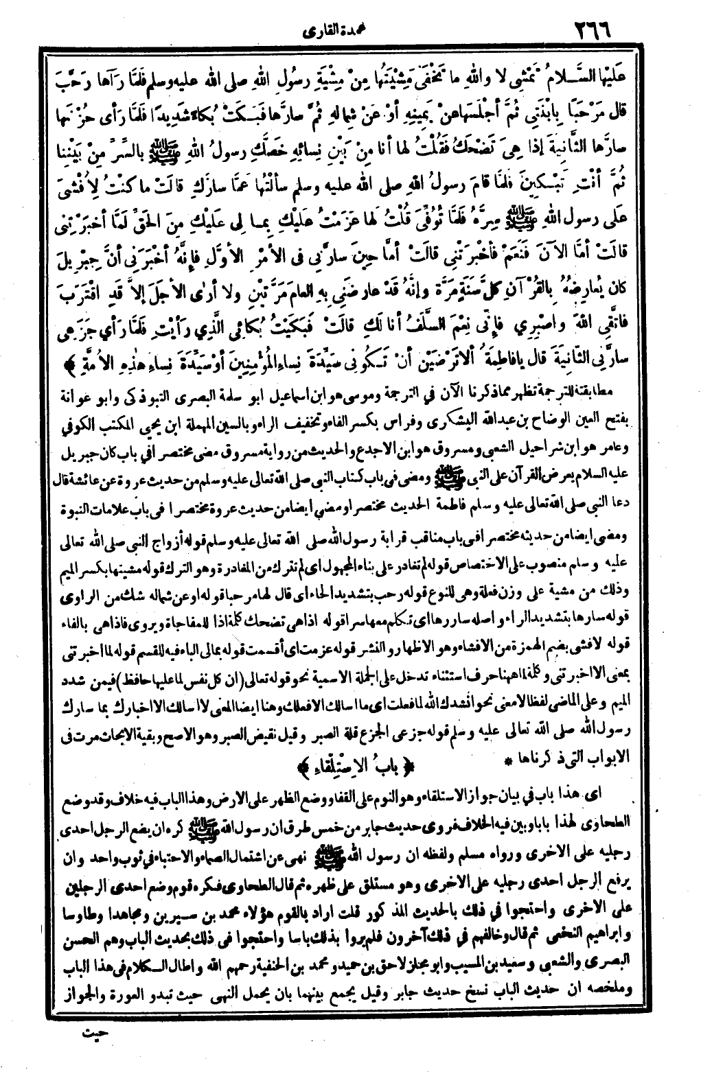 عَلَيْها السَّلامُ، تَمْشِي لَا وَالله مَا تَخْفَى مِشيتُها مِنْ مِشْيَةِ رَسُولِ الله صلى الله عَلَيْهِ وَسلم، فَلَمَّا رَآها رَحَّبَ قَالَ: مَرْحَباً بِابْنَتِي، ثُمَّ أجْلَسَها عَنْ يَمِينِهِ أوْ عَنْ شِمَالِهِ ثُمَّ سارَّها فَبَكَتْ بُكاءً شَدِيداً، فَلَمَّا رَأى حُزْنَها سارَّها الثَّانِيَةَ إِذا هِيَ تَضْحَكُ، فَقُلْتُ لَهَا: أَنا مِنْ بَيْنِ نِسائِهِ خَصَّكِ رسولُ الله صلى الله عَلَيْهِ وَسلم بالسِّرِّ مِنْ بَيْنَنَا ثُمَّ أنْتِ تَبْكِينَ، فَلَمَّا قامَ رسولُ الله صلى الله عَلَيْهِ وَسلم، سألْتُها عَمَّا سارَكِ قالَتْ: مَا كنْتُ لأُفْشيَ عَلى رَسُول الله صلى الله عَلَيْهِ وَسلم سِرَّهُ، فَلَمَّا تُوُفِّيَ قُلْتُ لَها: عَزَمْتُ عَلَيْكِ بِما لِي عَلَيْكِ مِنَ الحَقِّ لَمَّا أخبَرْتَنِي. قالَتْ: أمَّا الآنَ فَنَعَمْ، فأخْبرَتْنِي قالَتْ: أمَّا حِينَ سارَّبِي فِي الأمْرِ الأوَّلِ أخْبَرَنِي أنَّ جِبْرِيلَ كَانَ يُعارِضُهُ بِالقُرْآنِ كلَّ سَنَةٍ مَرَّة وإنَّهُ قَدْ عارضَنِي بِهِ العامَ مَرَّتَيْنِ، وَلَا أراى الأجَلَ إلاَّ قَدِ اقْتَرَبَ فاتَّقِي الله واصْبِرِي فإِنِّي نِعْمَ السَّلَفُ أَنا لَكِ، قالَتْ: فَبَكَيْتُ بكائِي الَّذِي رَأيْتِ، فَلَمَّا رَأى جَزَعِي سارَّنِي الثَّانِيَةَ، قَالَ: يَا فاطِمَةُ أَلا تَرْضَيْن أنْ تَكُونِي سَيِّدَةَ نِساءِ المُؤْمِنِينَ أَو سَيِّدَةَ نِساءِ هاذِهِ الأُمَّةِ.