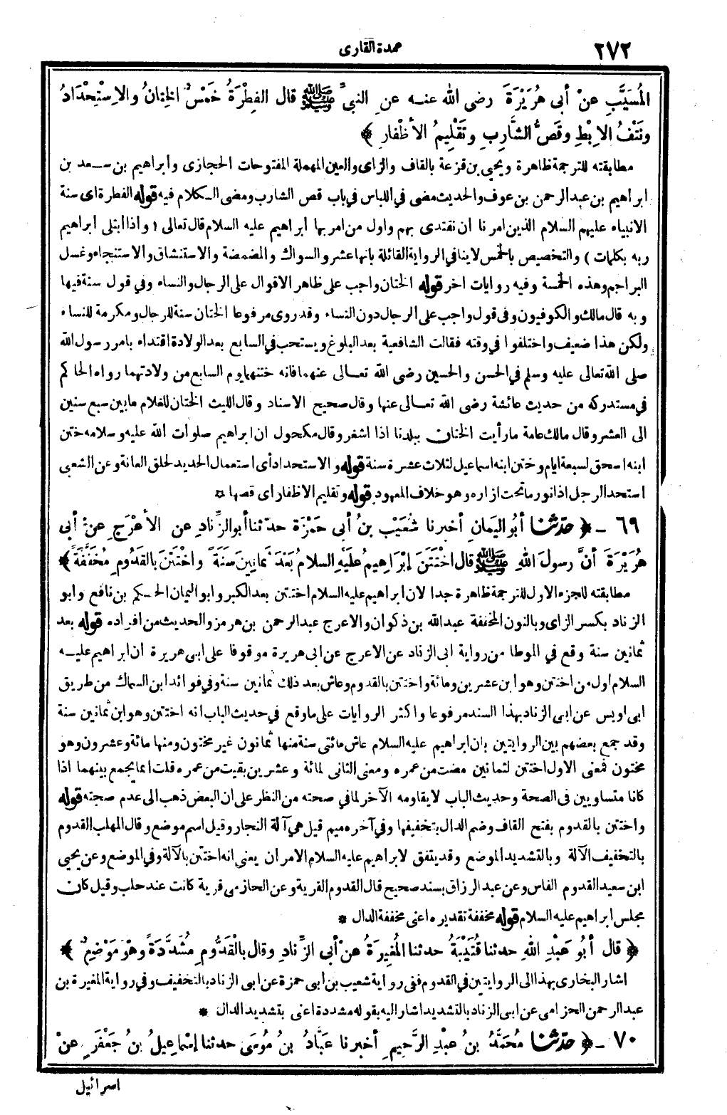 المُسَيَّبِ عَنْ أبي هُرَيْرَةَ رَضِي الله عَنهُ عَنِ النبيِّ صلى الله عَلَيْهِ وَسلم قَالَ: الفِطْرَةُ خَمْسٌ: الخِتانُ والاسْتِحْدَادُ وَنَتْفُ الإبْطِ وَقَصُّ الشَّارِبِ وَتَقْلِيمُ الأظْفارِ. (انْظُر الحَدِيث 5889) .