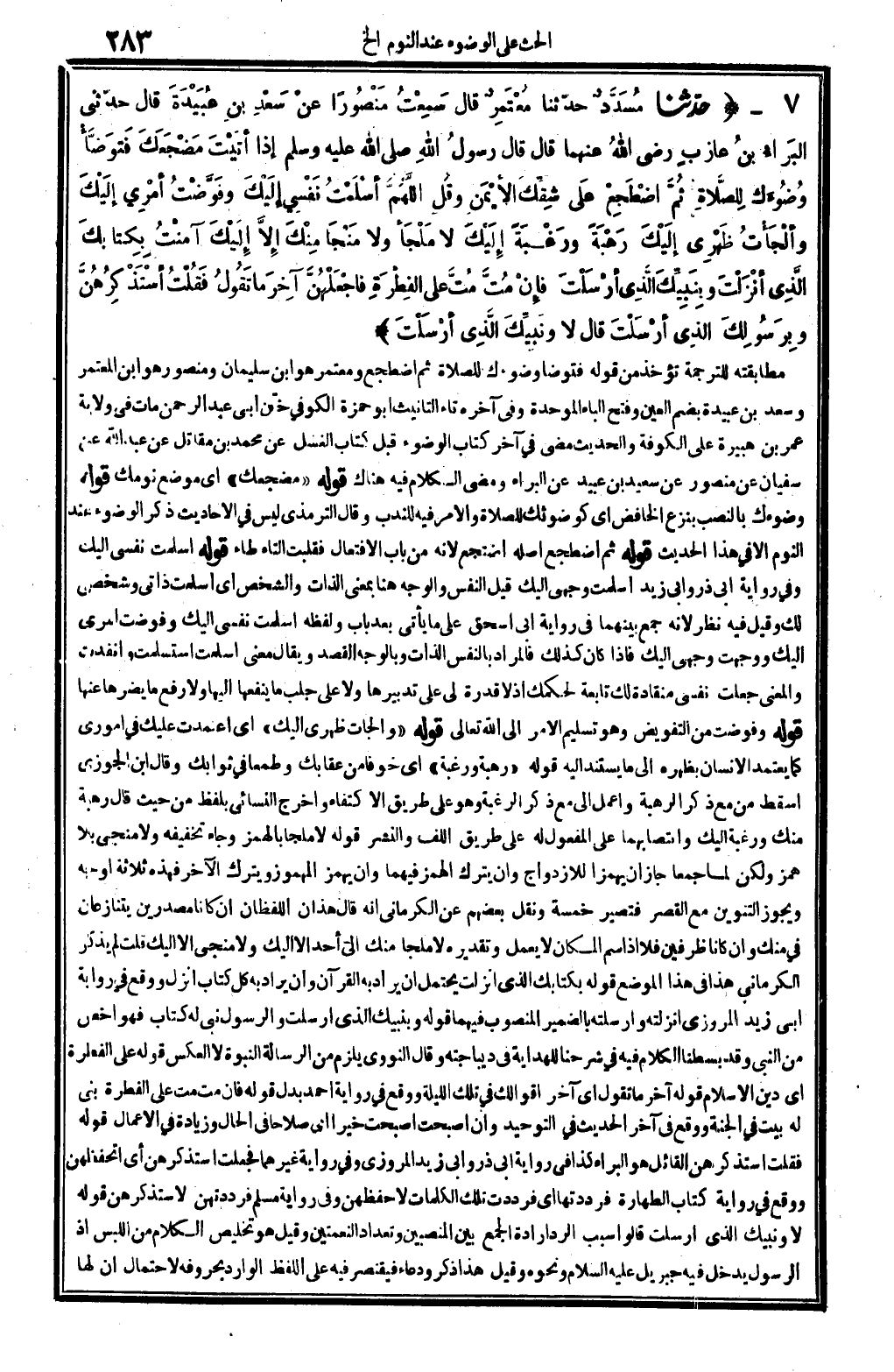 6311 - حدَّثنا مُسَدَّدٌ حدّثنا مُعْتَمِرٌ قَالَ: سَمِعْتُ مَنْصُوراً عنْ سَعْدِ بنِ عُبَيْدَةَ قَالَ: حدّثني البَراءُ بنُ عازِبٍ رَضِي الله عَنْهُمَا قَالَ: قَالَ رسولُ الله صلى الله عَلَيْهِ وَسلم: إِذا أتَيْتَ مَضْجَعَكَ فَتَوَضَّأْ وُضُوءَكَ للصَّلاةِ ثُمَّ اضْطَجِعْ عَلى شِقِّكَ الأيْمَنِ، وقُلِ: أللَّهُمَّ أسْلَمْتُ نَفْسِي إلَيْكَ، وفَوَّضْتُ أمْرِي إلَيْكَ، وألْجَأْتُ ظَهْرِي إلَيْكَ، رَهْبَةً ورَغْبَةً إلَيْكَ، لَا مَلْجَأ وَلَا مَنْجَا مِنْكَ إلاَّ إلَيْكَ، آمَنْتُ بِكِتابكَ الَّذِي أنْزَلْتَ، وبِنَبَّيِّكَ الَّذِي أرْسَلْتَ، فإِنْ مُتَّ على الفِطْرَةِ فاجْعَلْهُنَّ آخِرَ مَا تَقُولُ. فَقُلْتُ: أسْتَذْكِرُهُنَّ وبِرَسُولِكَ الَّذِي أرْسَلْتَ. قَالَ: لَا ونَبِيِّكَ الَّذِي أرْسَلْتَ.