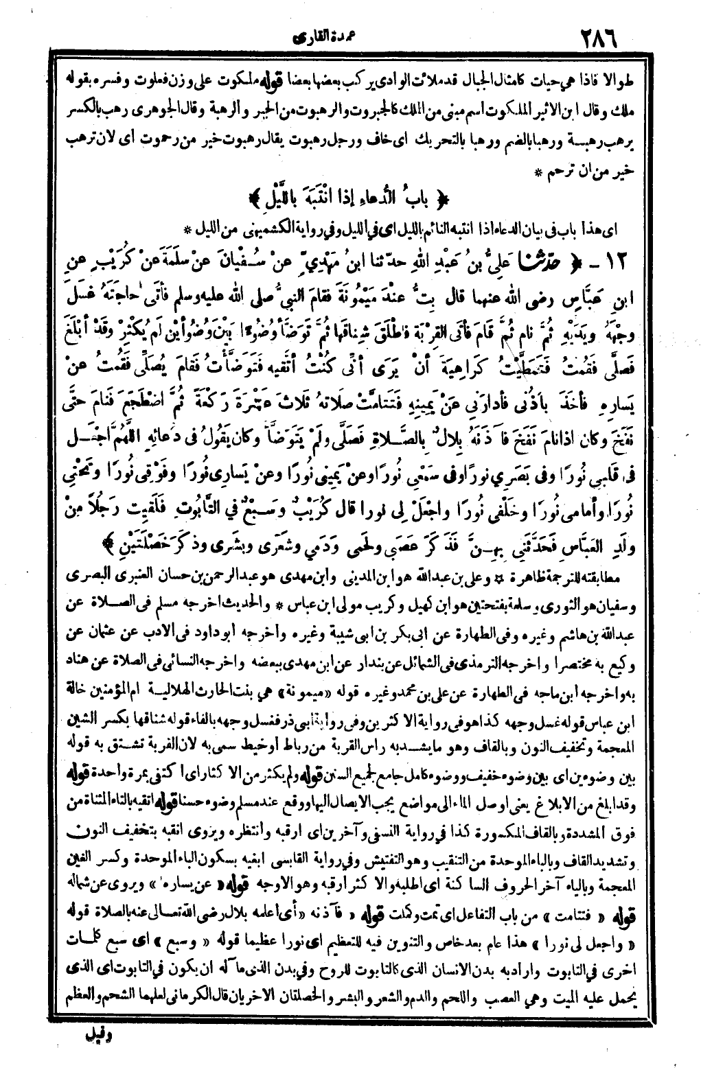 6316 - حدَّثنا عَلِيُّ بنُ عَبْدِ الله حدّثنا ابنُ مَهْدِيّ عنْ سُفْيانَ عنْ سَلَمَةَ عنْ كُرَيْبٍ عنِ ابنِ عَبَّاسٍ رَضِي الله عَنْهُمَا قَالَ: بِتُّ عِنْدَ مَيْمُونَةَ فقامَ النبيُّ صلى الله عَلَيْهِ وَسلم، فأتَى حاجَتَهُ غَسَلَ وَجْهَهُ وَيَدَيْهِ ثُمَّ قَامَ فأتَى القِرْبَة فأطْلَقَ شِناقَها ثُمَّ تَوَضَّأ وُضُوءاً بَيْنَ وُضُوأيْن لَمْ يُكْثِرْ، وَقَدْ أبْلَغَ فَصَلَّى، فَقُمْتُ فَتَمَطَّيْتُ كَراهِيَّةَ أنْ يَرَى أنِّي كُنْتُ أتَّقيه، فَتَوَضَّأْتُ فَقامَ يُصَلِّي فَقُمْتُ عَنْ يَسارِهِ، فأخَذَ بأُذُنِي فأدارَنِي عَنْ يَمِينِهِ فَتَتامَّتْ صَلاتهُ ثَلاثَ عَشْرَةَ رَكْعَةً، ثُمَّ اضْطَجَعَ فَنامَ حَتَّى نَفَخَ وَكَانَ إِذا نامَ نَفَخَ فآذَنَهُ بِلالٌ بِالصَّلاةِ فَصَلَّى وَلَمْ يَتَوَضَّأْ، وَكَانَ يَقُولُ فِي دُعائِهِ: أللَّهُمَّ اجْعَل فِي قَلبي نُوراً، وَفِي بَصَرِي نورا، وَفِي سَمْعِي نُوراً، وعنْ يَمِيني نُوراً، وعنْ يَسارِي نُوراً، وَفوقِي نُوراً، وتَحْتِي نُوراً، وأمامي نُوراً، وخَلْفي نُوراً، واجْعَلْ لِي نورا قَالَ كُرَيْبٌ: وَسَبْعٌ فِي التَّابُوتِ، فَلَقِيت رَجُلاً مِنْ ولَدِ العَبَّاسِ فَحَدَّثَنِي بِهِنَّ، فَذَكَرَ عَصَبي ولَحمي وَدَمي وشَعَري وبشَري وذَكَرَ خَصْلَتَيْنِ.