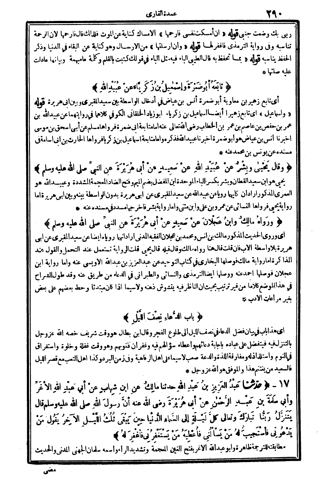 يحيى هُوَ ابْن سعيد الْقطَّان، وَبشر بِكَسْر الْبَاء الْمُوَحدَة ابْن الْمفضل بِضَم الْمِيم وَفتح الضَّاد الْمُعْجَمَة الْمُشَدّدَة، وَعبيد الله هُوَ الْعمريّ الْمَذْكُور، أَرَادَ أَن كليهمَا رويا عَن عبيد الله عَن سعيد المَقْبُري عَن أبي هُرَيْرَة بِدُونِ الْوَاسِطَة بَينه وَبَين أبي هُرَيْرَة، أما رِوَايَة يحيى فرواها النَّسَائِيّ عَن عَمْرو بن عَليّ وَابْن مثنى، وَأما رِوَايَة بشر فأخرجها مُسَدّد فِي (مُسْنده) عَنهُ.