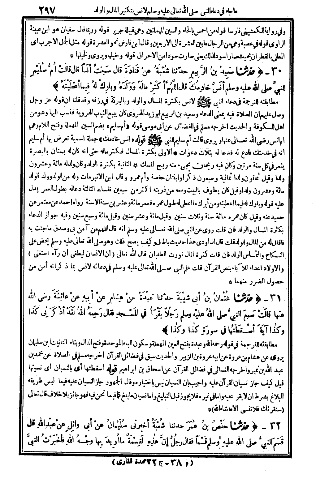 6335 - حدَّثنا عُثْمانُ بنُ أبي شَيْبَةَ حدّثنا عَبْدَةُ عنْ هِشامٍ عنْ أبِيهِ عنْ عائِشَةَ رَضِي الله عَنْهَا قالَتْ: سَمِعَ النبيُّ صلى الله عَلَيْهِ وَسلم رَجُلاً يَقْرَأُ فِي المَسْجِدِ. فَقَالَ رَحِمَهُ الله: لَقَدْ أذْكَرَنِي كَذا وَكَذَا آيَةً أسْقَطْتُها فِي سورَةِ كَذَا وَكَذَا.