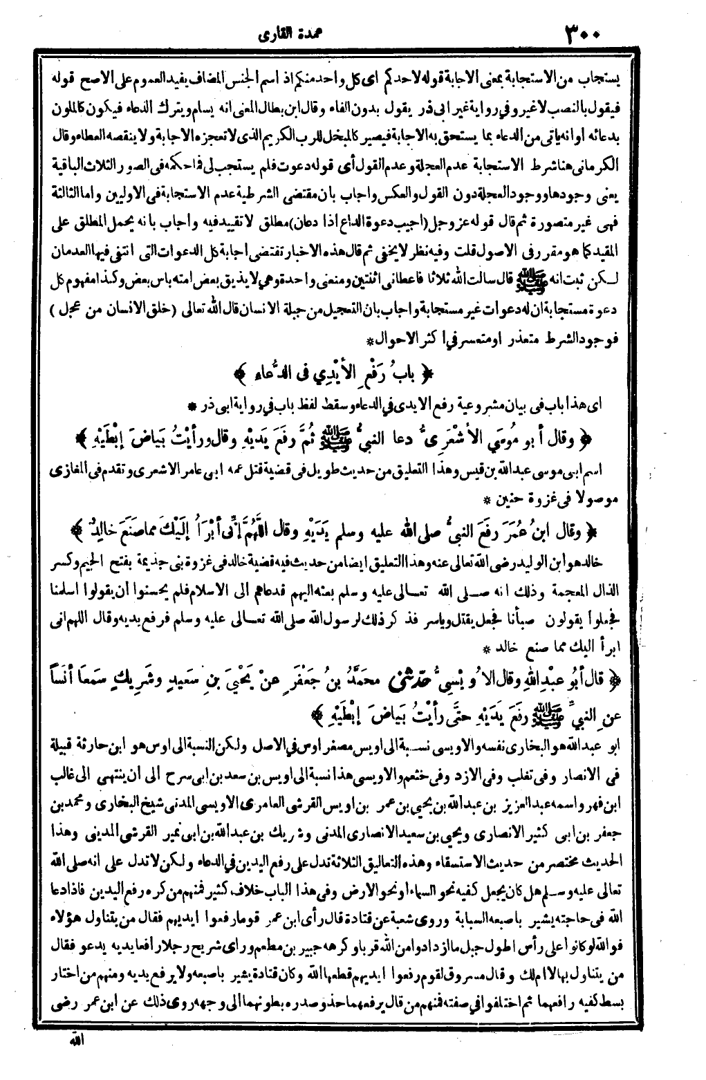 وَهَذَا الحَدِيث مُخْتَصر من حَدِيث الاسْتِسْقَاء، وَهَذِه التَّعَالِيق الثَّلَاثَة تدل على رفع الْيَدَيْنِ فِي الدُّعَاء، وَلَكِن لَا تدل على أَنه صلى الله عَلَيْهِ وَسلم. هَل كَانَ يَجْعَل كفيه نَحْو السَّمَاء أَو نَحْو الأَرْض، وَفِي هَذَا الْبَاب خلاف كثير، فَمنهمْ من كره رفع الْيَدَيْنِ فَإِذا دَعَا الله فِي حَاجته يُشِير بإصبعه السبابَة، وروى شُعْبَة عَن قَتَادَة قَالَ: رأى ابْن عمر قوما رفعوا أَيْديهم فَقَالَ: من يتَنَاوَل هَؤُلَاءِ؟ فوَاللَّه لَو كَانُوا على رَأس أطول جبل مَا ازدادوا من الله قرباً، وَكَرِهَهُ جُبَير بن مطعم، وَرَأى شُرَيْح رجلا رَافعا يَدَيْهِ يَدْعُو فَقَالَ: من يتَنَاوَل بهَا لَا أم لَك؟ وَقَالَ مَسْرُوق لقوم رفعوا أَيْديهم: قطعهَا الله، وَكَانَ قَتَادَة يُشِير بإصبعه وَلَا يرفع يَدَيْهِ، وَمِنْهُم من اخْتَار بسط كفيه رافعهما، ثمَّ اخْتلفُوا فِي صفته، فَمنهمْ من قَالَ: يرفعهما حَذْو صَدره بطونهما إِلَى وَجهه، رُوِيَ ذَلِك عَن ابْن عمر رَضِي