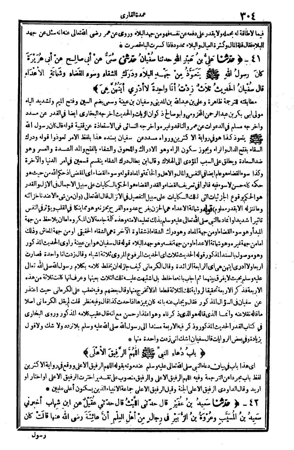 أَي: هَذَا بَاب فِي بَيَان دُعَاء النَّبِي صلى الله عَلَيْهِ وَسلم، عِنْد مَوته بقوله: (أللَّهُمَّ الرفيق الْأَعْلَى) . وَوَقع فِي رِوَايَة الْأَكْثَرين لفظ: بَاب، مُجَردا عَن التَّرْجَمَة، وَفِيه: أللهم الرفيق الْأَعْلَى، والرفيق مَنْصُوب على تَقْدِير: اختبرت الرفيق الْأَعْلَى، أَو: أخْتَار، أَو: أُرِيد. وَقَالَ الدَّاودِيّ: الرفيق الْأَعْلَى الْجنَّة، وَقيل: الرفيق الْأَعْلَى جمَاعَة الْأَنْبِيَاء الَّذين يسكنون أَعلَى عليين.