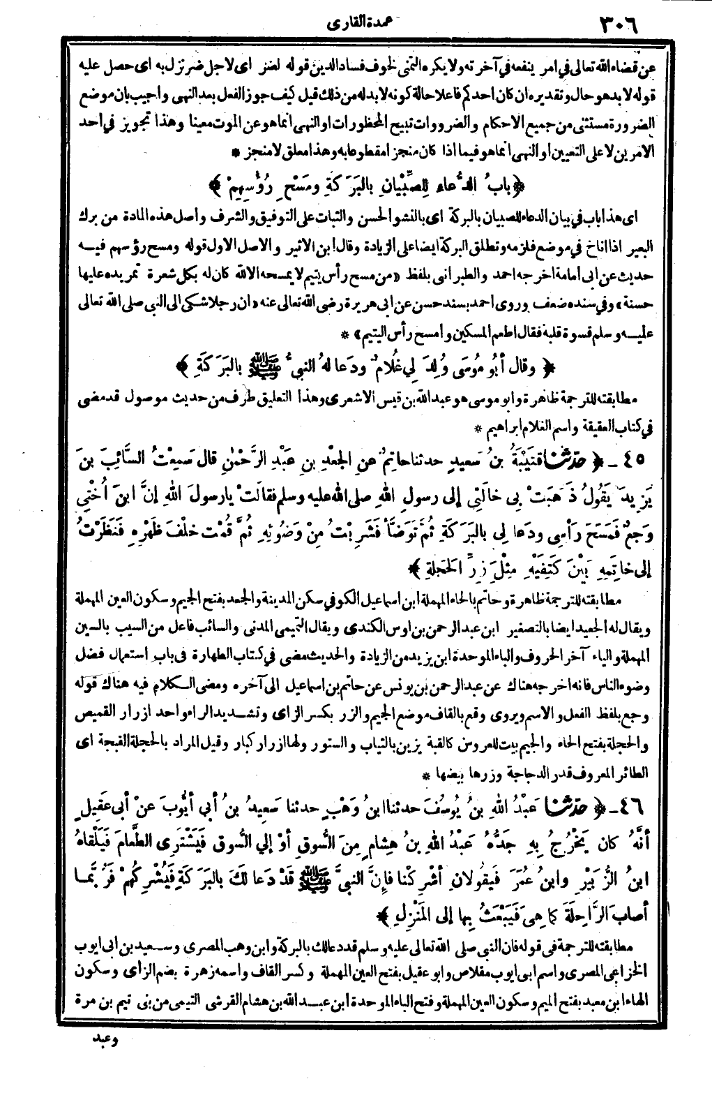 أَي: هَذَا بَاب فِي بَيَان الدُّعَاء للصبيان بِالْبركَةِ أَي: بالنشو الْحسن والثبات على التَّوْفِيق والشرف. وأصل هَذِه الْمَادَّة من برك الْبَعِير إِذا أَنَاخَ فِي مَوضِع فَلَزِمَهُ، وَتطلق الْبركَة أَيْضا على الزِّيَادَة. وَقَالَ ابْن الْأَثِير: وَالْأَصْل الأول. قَوْله: وَمسح رؤوسهم، فِيهِ حَدِيث عَن أبي أُمَامَة أخرجه أَحْمد وَالطَّبَرَانِيّ بِلَفْظ: (من مسح رَأس يَتِيم لَا يمسحه إلاَّ الله كَانَ لَهُ بِكُل شَعْرَة تمريده عَلَيْهَا حَسَنَة) ، وَفِي سَنَده ضعف، وروى أَحْمد بِسَنَد حسن عَن أبي هُرَيْرَة رَضِي الله عَنهُ (أَن رجلا شكى إِلَى النَّبِي صلى الله عَلَيْهِ وَسلم، قسوة قلبه، فَقَالَ: أطْعم الْمِسْكِين وامسح رَأس الْيَتِيم) .
