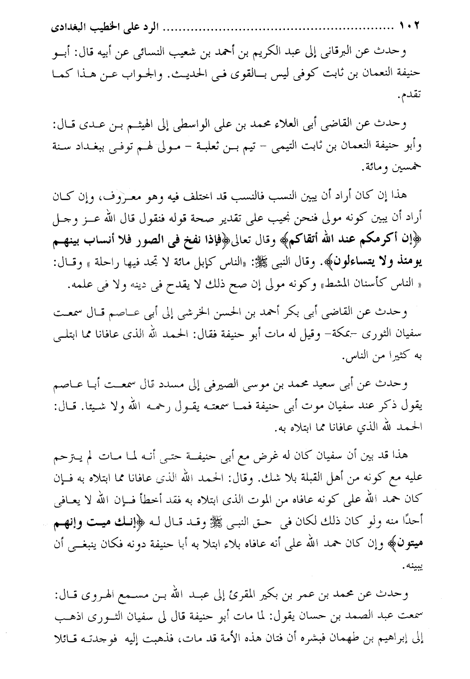 هذا قد بين أن سفيان كان له غرض مع أبى حنيفة حتى أنه لما مات لم يترحم عليه مع كونه من أهل القبلة بلا شك. وقال: الحمد الله الذي عافانا مما ابتلاه به فإن كان حمد الله على كونه عافاه من الموت الذي ابتلاه به فقد أخطأ فإن الله لا يعافى أحدا منه ولو كان ذلك لكان في حق النَّبِيِّ صَلَّى اللَّهُ عَلَيْهِ وَسَلَّمَ وَقَدْ قَالَ له إِنَّكَ مَيِّتٌ وَإِنَّهُمْ مَيِّتُونَ