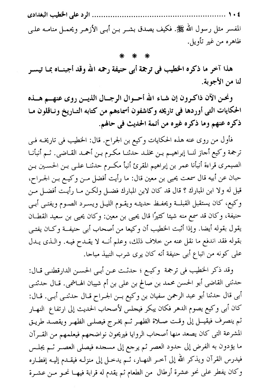 فأول من روى عنه هذه الحكايات وكيع بن الجراح. قال: الخطيب في تاريخه في ترجمة وكيع أجاز لنا إبراهيم بن مخلد حدثنا مكرم بن أحمد القاضي. ثم أنبأنا الصيمري قراءة أنبأنا عمر بن إبراهيم المقرئ أنبأ مكرم حدثنا علي بن الحسين بن حبان عن أبيه قال سمعت يحيى بن معين قال: ما رأيت أفضل من وكيع بن الجراح، قيل له ولا ابن المبارك؟ قال قد كان لابن المبارك فضل ولكن ما رأيت أفضل من وكيع، كان يستقبل القبلة ويحفظ حديثه ويقوم الليل ويسرد الصوم ويفتي أبي حنيفة، وكان قد سمع منه شيئا كثيرا قال يحيى بن معين: وكان يحيى بن سعيد القطان يقول بقوله أيضا. وإذا أثبت الخطيب أن وكيعا من أصحاب أبى حنيفة وكان يفتي بقوله فقد اندفع ما نقل عنه من خلاف ذلك، وعلم أنه لا يقدح فيه. والذي يدل على كونه من اتباع أبى حنيفة أنه كان يرى شرب النبيذ مباحا.