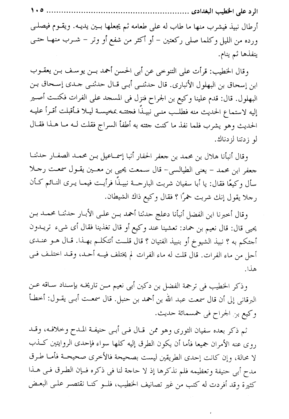 وقال أخبرنا ابن الفضل أنبأنا دعلج حدثنا أحمد بن على الأبار حَدَّثَنَا مُحَمَّد بن يحيى قال: قال نعيم بن حماد: تعشينا عند وكيع أو قال تغذينا فقال أي شيء تريدون أجيئكم به؟ نبيذ الشيوخ أو بنبيذ الفتيان؟ قال قلت أتتكلم بهذا. قال هو عندي أحل من ماء الفرات. قال قلت له ماء الفرات لم يختلف فيه أحد، وقد اختلف في هذا.