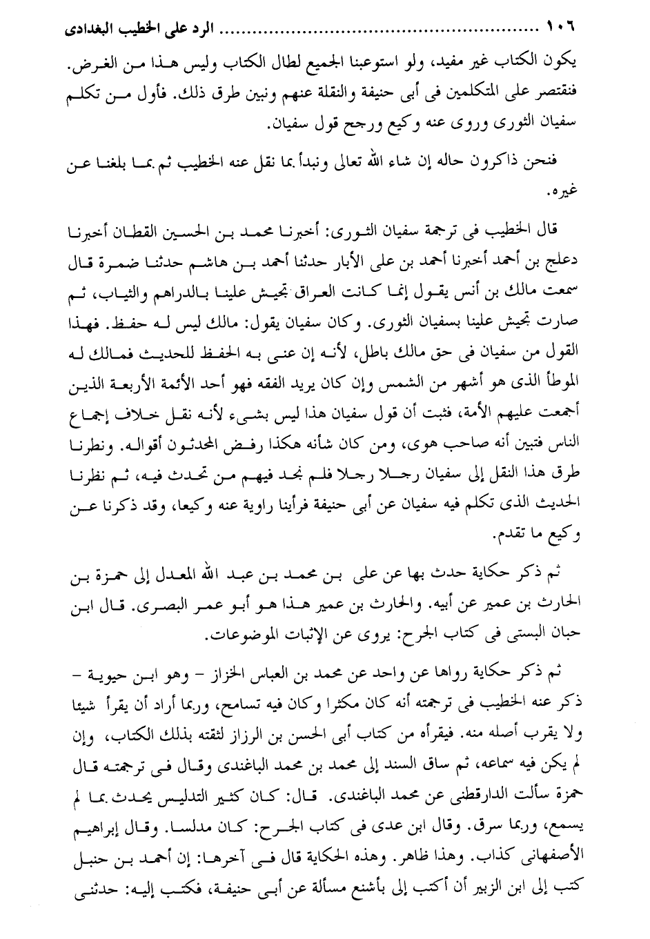 فنقتصر على المتكلمين في أبى حنيفة والنقلة عنهم ونبين طرق ذلك. فأول من تكلم سفيان الثوري وروى عنه وكيع ورجح قول سفيان.