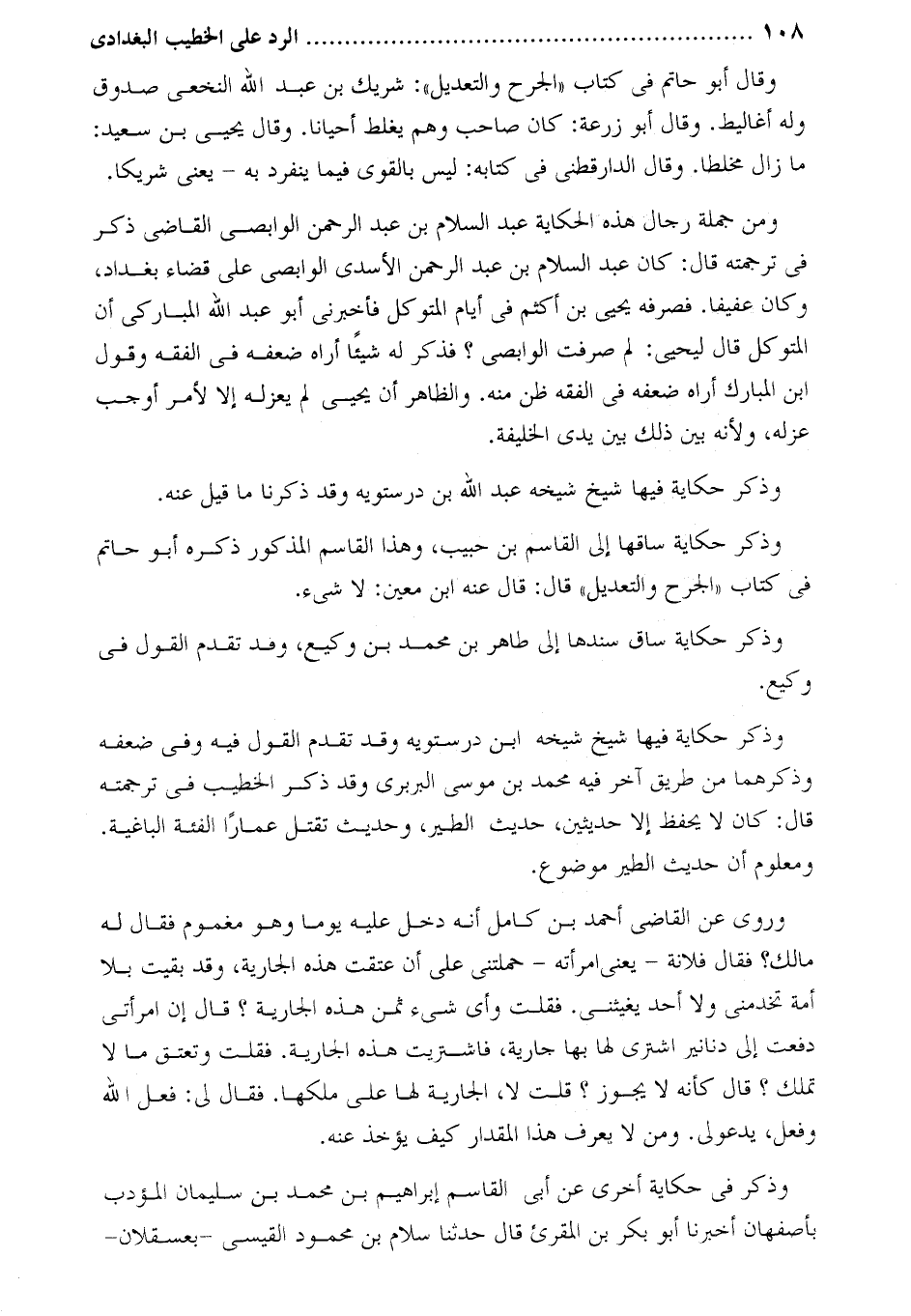 وروى عن القاضي أحمد بن كامل أنه دخل عليه يوما وهو مغموم فقال له مالك؟ فقال فلانة- يعنى امرأته- حملتني على أن عتقت هذه الجارية، وقد بقيت بلا أمة تخدمني ولا أحد يغيثنى. فقلت وأى شيء ثمن هذه الجارية؟ قَالَ إن امرأتي دفعت إلى دنانير اشترى لها بها جارية، فاشتريت هذه الجارية. فقلت وتعتق ما لا تملك؟ قَالَ كأنه لا يجوز؟ قلت لا، الجارية لها على ملكها. فقال لي: فعل الله وفعل، يدعو لي. ومن لا يعرف هذا المقدار كيف يؤخذ عنه.