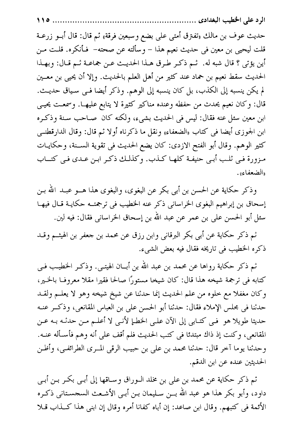 قال: وكان نعيم يحدث من حفظه وعنده مناكير كثيرة لا يتابع عليها. وسمعت يحيى ابن معين سئل عنه فقال: ليس في الحديث بشيء، ولكنه كان صاحب سنة وذكره ابن الجوزي أيضا في كتاب «الضعفاء» ونقل ما ذكرناه أولا ثم قال: وقال الدارقطني كثير الوهم. وقال أبو الفتح الأزدي: كان يضع الحديث في تقوية السنة، وحكايات مزورة في ثلب أبى حنيفة كلها كذب. وكذلك ذكر ابن عدى في كتاب «الضعفاء» .