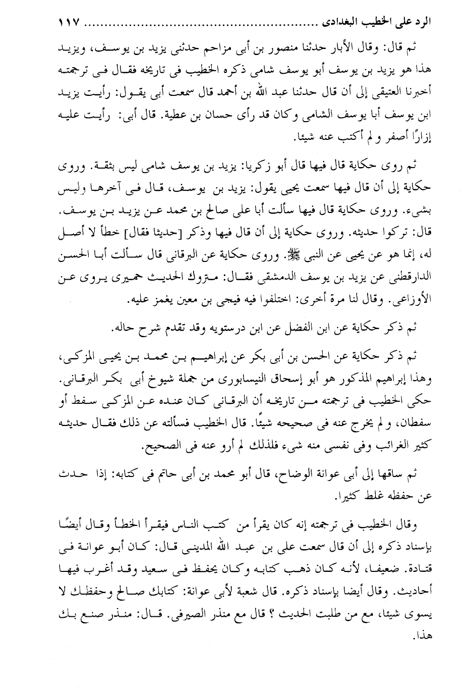 ثم قال: وقال الأبار حَدَّثَنَا منصور بن أبي مزاحم حدثني يزيد بن يوسف، ويزيد هذا هو يزيد بن يوسف أبو يوسف شامي ذكره الخطيب في تاريخه فقال في ترجمته أخبرنا العتيقى إلى أن قال حدثنا عبد الله بن أحمد قال سمعت أبى يقول: رأيت يزيد ابن يوسف أَبَا يوسف الشامي وكان قد رأى حسَّان بْن عطية. قَالَ أبي: رأيتُ عَلَيْهِ إزارا أصفر ولم أكتب عنه شيئا.