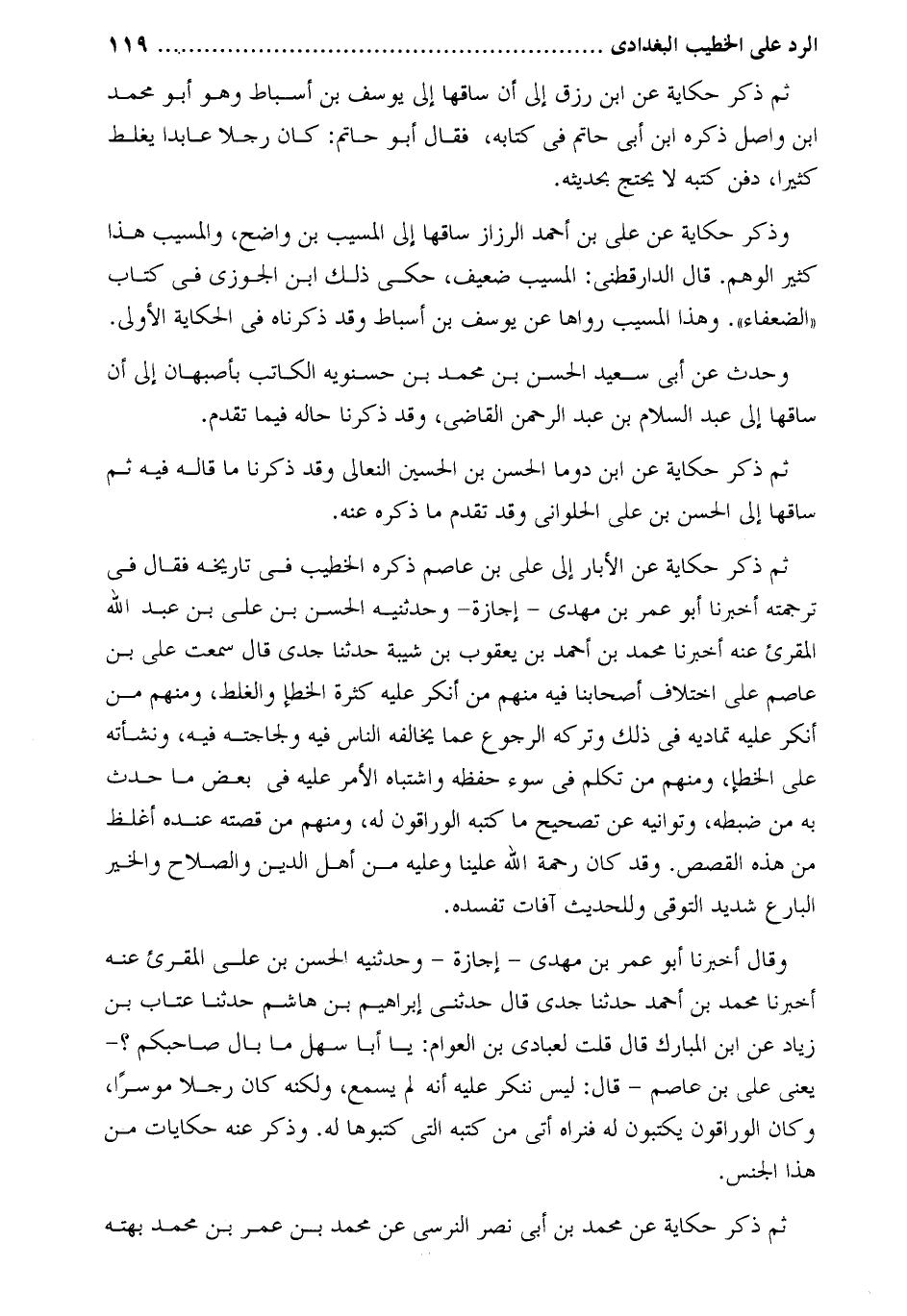 ثم ذكر حكاية عن الأبار إلى على بن عاصم ذكره الخطيب في تاريخه فقال في ترجمته أَخْبَرَنَا أَبُو عُمَر بْن مهدي- إجازة- وَحَدَّثَنِيه الحسن بن علي بن عبد الله المقرئ عَنْهُ أَخْبَرَنَا مُحَمَّد بْن أَحْمَدَ بْن يَعْقُوب بن شيبة حَدَّثَنَا جدي قَالَ سمعت علي بْن عاصم على اختلاف أصحابنا فيه منهم من أنكر عليه كثرة الخطأ والغلط، ومنهم من أنكر عليه تماديه فِي ذلك وتركه الرجوع عما يخالفه الناس فيه ولجاجته فيه، ونشأته على الخطأ، ومنهم من تكلم فِي سوء حفظه واشتباه الأمر عليه فِي بعض ما حدث به من ضبطه، وتوانيه عن تصحيح ما كتبه الوراقون له، ومنهم من قصته عنده أغلظ من هذه القصص. وقد كان رحمة اللَّه علينا وعليه من أهل الدين والصلاح والخير البارع شديد التوقي وللحديث آفات تفسده.