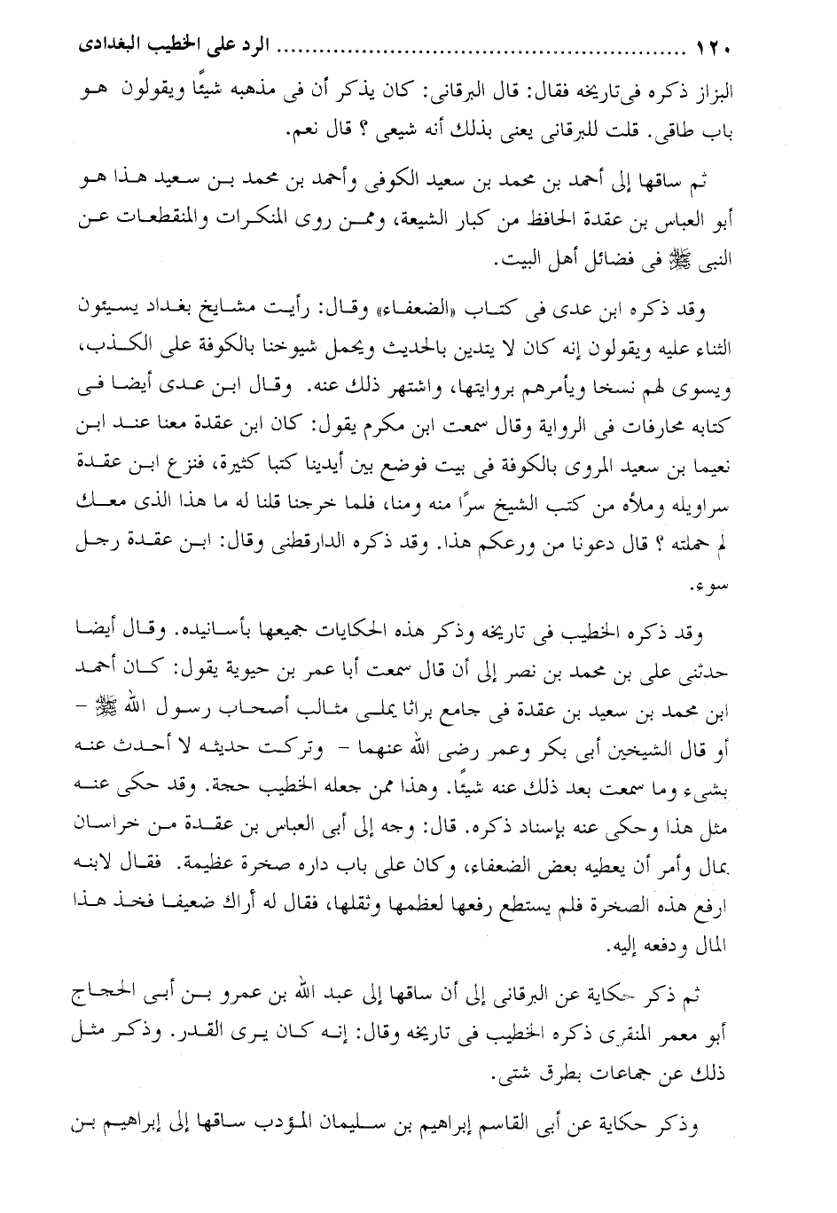 وقد ذكره الخطيب في تاريخه وذكر هذه الحكايات جميعها بأسانيده. وقال أيضا حدثني على بن محمد بن نصر إلى أن قَالَ سمعت أبا عُمَر بْن حيويه يَقُول: كان أحمد ابن مُحَمَّد بْن سعيد بْن عقدة فِي جامع براثا يملي مثالب أصحاب رَسُولِ اللَّه صَلَّى اللَّهُ عَلَيْهِ وَسَلَّمَ- أو قال الشيخين أبى بكر وعمر رضى الله عنهما- وتركت حديثه لا أحدث عنه بشيء وما سمعت بعد ذلك عنه شيئا. وهذا ممن جعله الخطيب حجة. وقد حكى عنه مثل هذا وحكى عنه بإسناد ذكره. قال: وجه إِلَى أَبِي العباس بْن عقدة من خراسان بمال وأمر أن يعطيه بعض الضعفاء، وكَانَ عَلَى باب داره صخرة عظيمة. فقال لابنه ارفع هذه الصخرة فلم يستطع رفعها لعظمها وثقلها، فقال له أراك ضعيفا فخذ هذا المال ودفعه إليه.