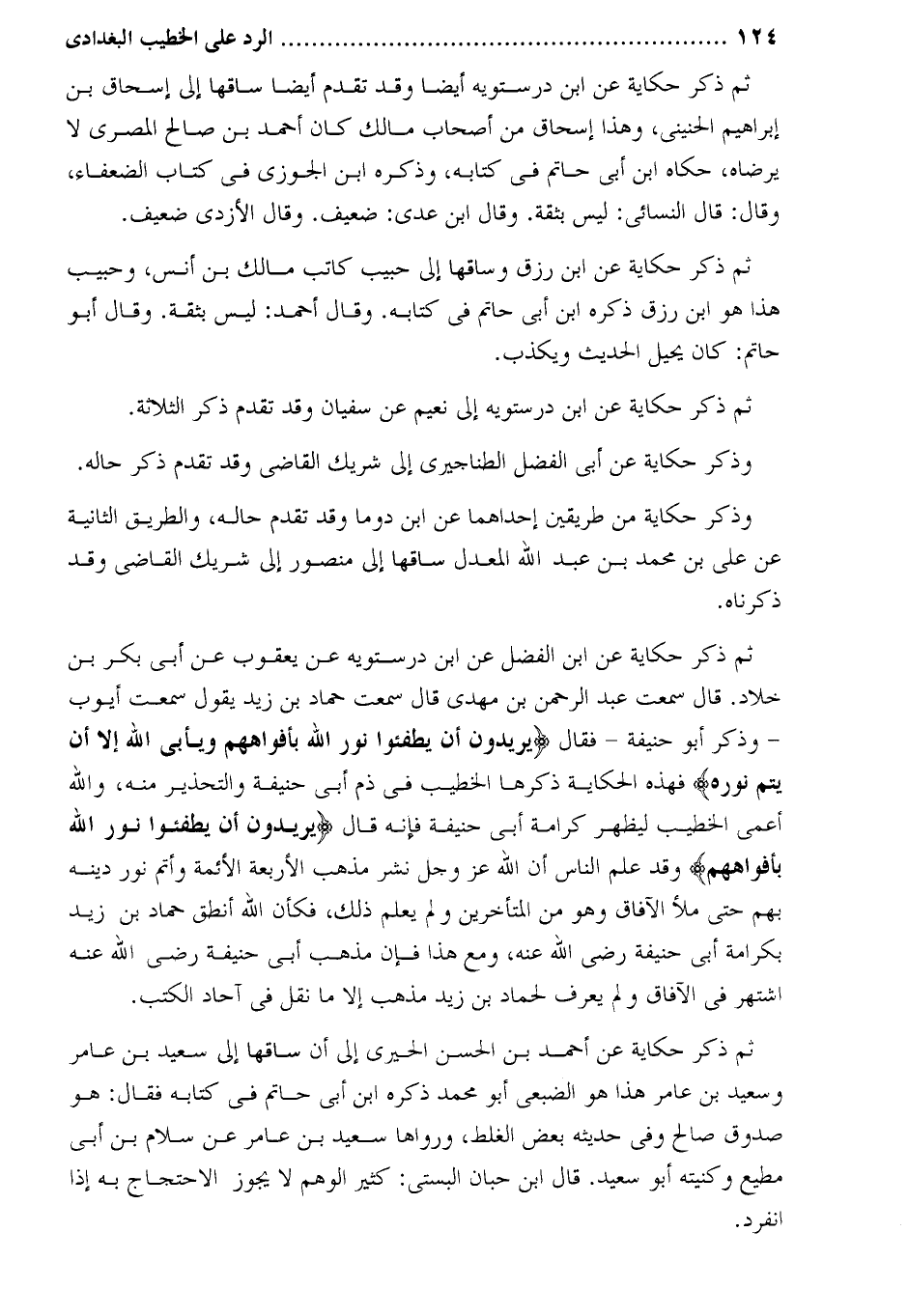 ثم ذكر حكاية عن ابن الفضل عن ابن درستويه عن يعقوب عن أبى بكر بن خلاد. قال سمعت عبد الرحمن بن مهدي قَالَ سَمِعْتُ حَمَّاد بْن زَيْد يَقُولُ سَمِعْتُ أيوب- وذكر أَبُو حنيفة- فقال يُرِيدُونَ أَنْ يُطْفِؤُا نُورَ اللَّهِ بِأَفْواهِهِمْ وَيَأْبَى اللَّهُ إِلَّا أَنْ يُتِمَّ نُورَهُ