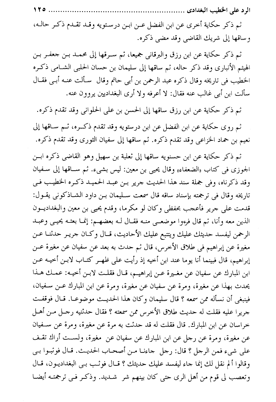 ثم ذكر حكاية عن ابن حسنويه ساقها إلى ثعلبة بن سهيل وهو القاضي ذكره ابن الجوزي في كتاب «الضعفاء» وقال يحيى بن معين: ليس بشيء. ثم ساقها إلى سفيان وقد ذكرناه، وفي جملة سند هذا الحديث جرير بن عبد الحميد ذكره الخطيب في تاريخه وقال في ترجمته بإسناد ساقه قَالَ سمعت سُلَيْمَان بن داود الشاذكوني يقول: