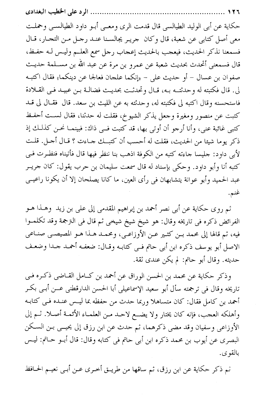 وذكر حكاية عن محمد بن الحسن الوراق عن أحمد بن كامل القاضي ذكره في تاريخه وقال في ترجمته سأل أبو سعيد الإسماعيلي أَبَا الْحَسَن الدارقطني عَنْ أَبِي بَكْر أَحْمَد بْن كامل فَقَالَ: كَانَ متساهلا وربما حدث من حفظه بما ليس عنده فِي كتابه وأهلكه العجب، فإنه كَانَ يختار ولا يضع لأحد من العلماء الأئمة أصلا. ثم إلى الأوزاعى وسفيان وقد مضى ذكرهما، ثم حدث عن ابن رزق إلى يحيى بن السكن البصري عن أيوب بن محمد ذكره ابن أبى حاتم في كتابه وقال: قال أبو حاتم: ليس بالقوى.