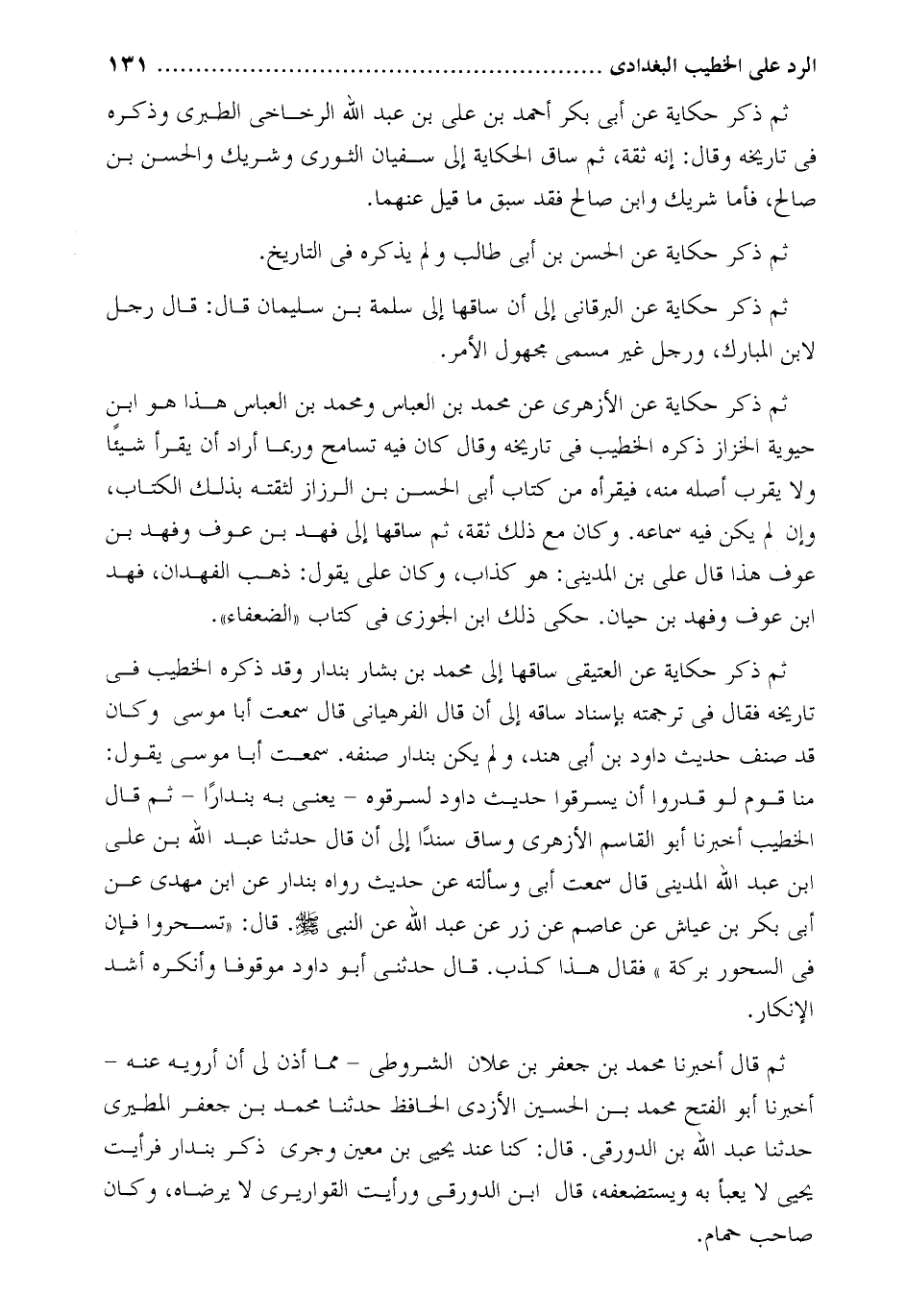 ثم ذكر حكاية عن أبى بَكْر أَحْمَد بْن عَلِيّ بْن عَبْد اللَّهِ الرخاخى الطبري وذكره في تاريخه وقال: إنه ثقة، ثم ساق الحكاية إلى سفيان الثوري وشريك والحسن بن صالح، فأما شريك وابن صالح فقد سبق ما قيل عنهما.