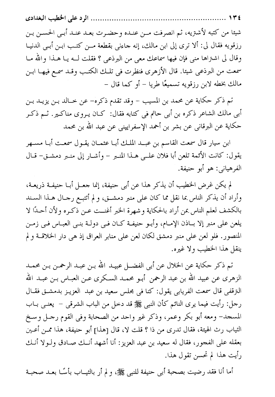لم يكن غرض الخطيب أن يذكر هذا عن أبى حنيفة، إنما جعل أبا حنيفة ذريعة، وأراد أن يذكر الناس بما نقل مما كان على منبر دمشق، ولم أتتبع رجال هذا السند بالكشف لعلم الناس بمن أراد بالحكاية وشهرة الخبر أغنت عن ذكره ولأن أحدا لا يلعن على منبر إلا بإذن الإمام، وأبو حنيفة كان في دولة بنى العباس في زمن المنصور. فلو لعن على منبر دمشق لكان لعن على منابر العراق إذ هي دار الخلافة ولم ينقل هذا الخطيب ولا غيره.