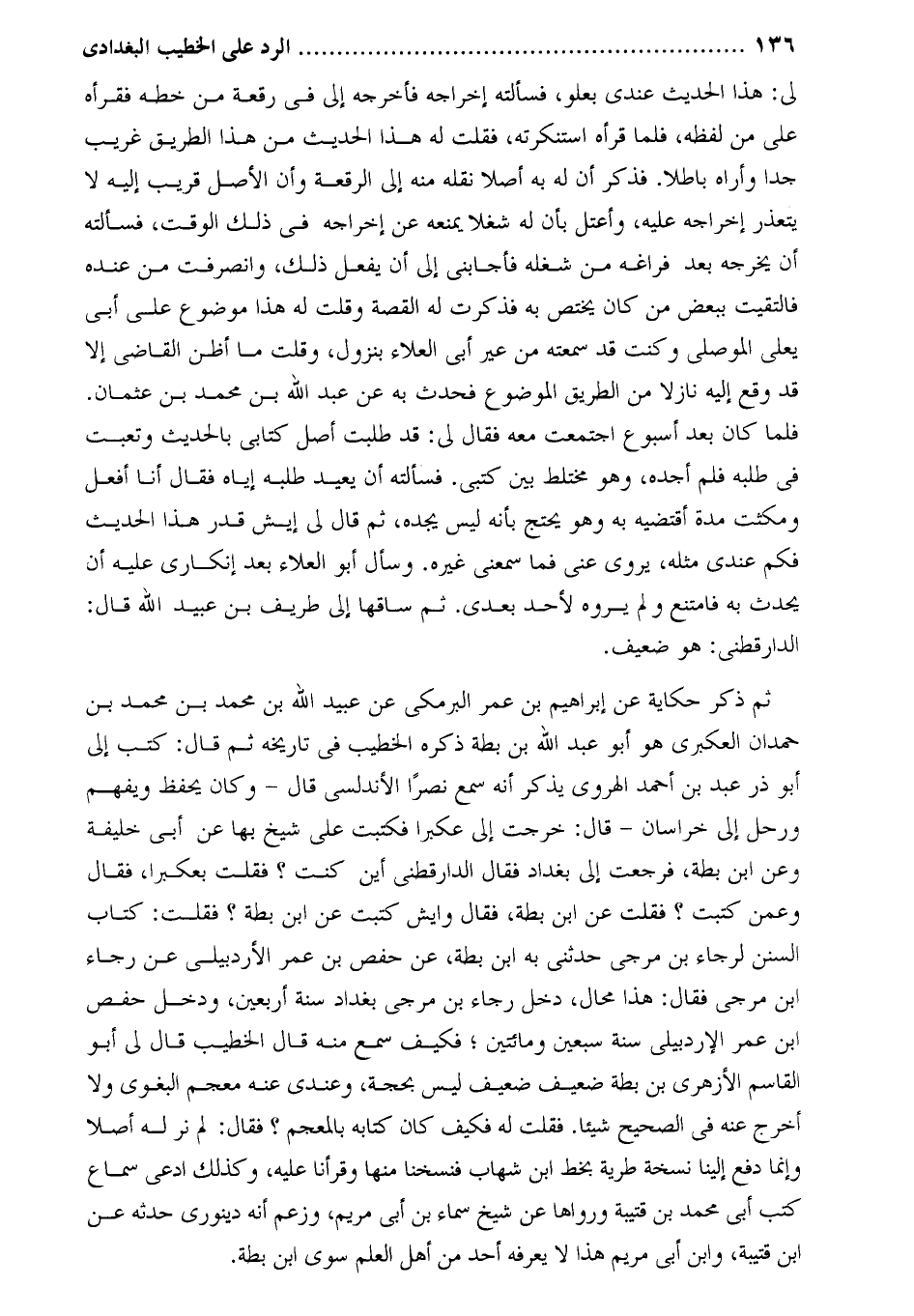 ثم ذكر حكاية عن إبراهيم بن عمر البرمكي عن عبيد اللَّه بْن مُحَمَّد بْن مُحَمَّد بْن حمدان العكبري هو أبو عبد الله بن بطة ذكره الخطيب في تاريخه ثم قال: كتب إلي أَبُو ذر عَبْد بْن أَحْمَد الهروي يذكر أنه سمع نصرا الأندلسي قال- وكان يحفظ ويفهم ورحل إلى خراسان- قال: خرجت إلى عكبرا فكتبت على شيخ بها عن أبي خليفة وعن ابن بطة، فرجعت إلى بغداد فقال الدارقطني أين كنت؟ فقلت بعكبرا، فقال وعمن كتبت؟ فقلت عن ابن بطة، فقال وإيش كتبت عن ابن بطة؟ فقلت: كتاب السنن لرجاء بن مرجي حَدَّثَنِي به ابن بطة، عن حفص بن عمر الأردبيلي عن رجاء ابن مرجي فقال: هذا محال، دخل رجاء بن مرجى بغداد سنة أربعين، ودخل حفص ابن عمر الأردبيلى سنة سبعين ومائتين؛ فكيف سمع منه قال الخطيب قال لي أبو القاسم الأزهرى بن بطة ضعيف ضعيف ليس بحجة، وعندي عنه معجم البغوي ولا أخرج عنه في الصحيح شيئا. فقلت له فكيف كان كتابه بالمعجم؟ فقال: لم نر له أصلا وإنما دفع إلينا نسخة طرية بخط ابن شهاب فنسخنا منها وقرأنا عليه، وكذلك ادعى سماع كتب أبي محمد بن قتيبة ورواها عن شيخ سماء بن أبي مريم، وزعم أنه دينوري حدثه عن ابن قتيبة، وابن أبي مريم هذا لا يعرفه أحد من أهل العلم سوى ابن بطة.