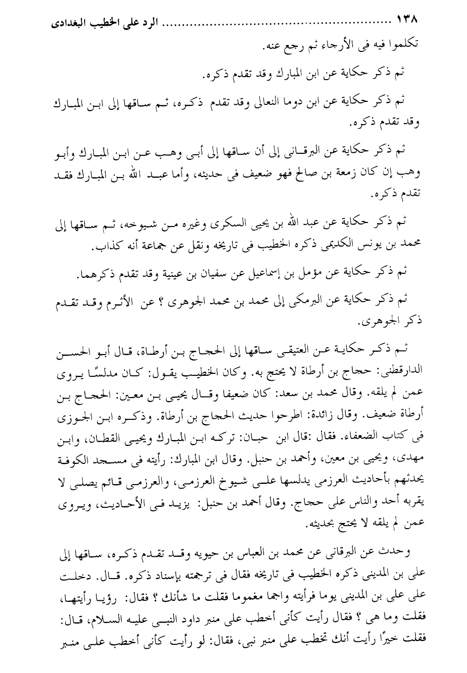 ثم ذكر حكاية عن العتيقى ساقها إلى الحجاج بن أرطاة، قال أبو الحسن الدارقطني: حجاج بن أرطاة لا يحتج به. وكان الخطيب يقول: كان مدلسا يروى عمن لم يلقه. وقال محمد بن سعد: كان ضعيفا وقال يحيى بن معين: الحجاج بن أرطاة ضعيف. وقال زائدة: اطرحوا حديث الحجاج بن أرطاة. وذكره ابن الجوزي في كتاب الضعفاء. فقال: قال ابن حبان: تركه ابن المبارك ويحيى القطان، وابن مهدى، ويحيى بن معين، وأحمد بن حنبل. وقال ابن المبارك: رأيته في مسجد الكوفة يحدثهم بأحاديث العرزمي يدلسها على شيوخ العرزمي، والعرزمي قائم يصلى لا يقربه أحد والناس على حجاج. وقال أحمد بن حنبل: يزيد في الأحاديث، ويروى عمن لم يلقه لا يحتج بحديثه.