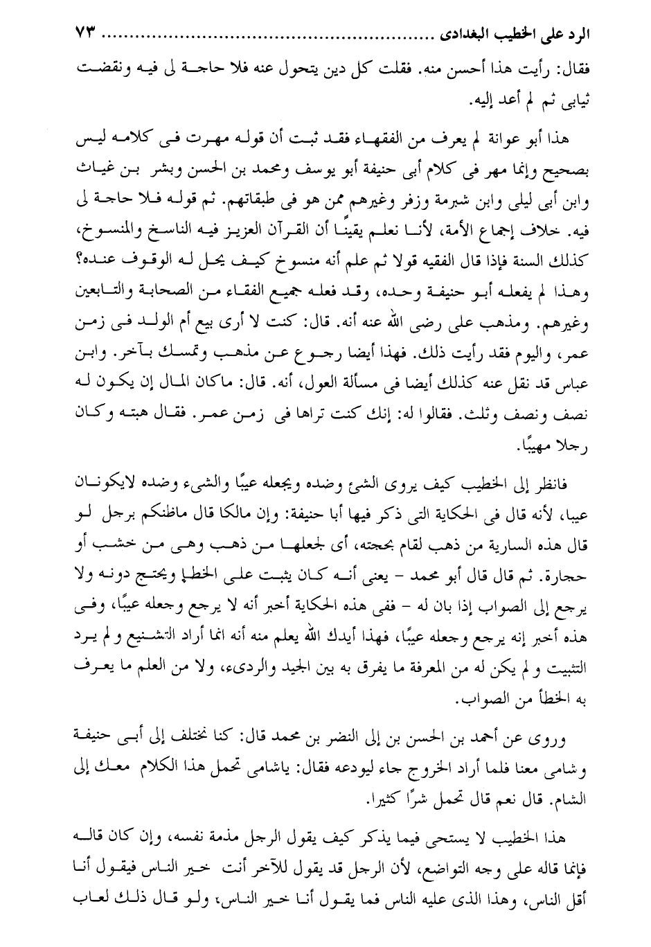 فانظر إلى الخطيب كيف يروى الشيء وضده ويجعله عيبا والشيء وضده لا يكونان عيبا، لأنه قال في الحكاية التي ذكر فيها أبا حنيفة: وإن مالكا قال ما ظنكم برجل لو قال هذه السارية من ذهب لقام بحجته، أى لجعلها من ذهب وهي من خشب أو حجارة. ثم قال قال أَبُو مُحَمَّد- يعني أنه كان يثبت على الخطأ ويحتج دونه ولا يرجع إلى الصواب إذا بان له- ففي هذه الحكاية أخبر أنه لا يرجع وجعله عيبا، وفي هذه أخبر إنه يرجع وجعله عيبا، فهذا أيدك الله يعلم منه أنه انما أراد التشنيع ولم يرد التثبيت ولم يكن له من المعرفة ما يفرق به بين الجيد والرديء، ولا من العلم ما يعرف به الخطأ من الصواب.