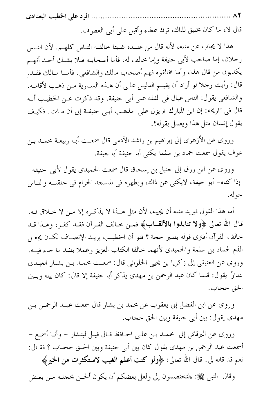 فمن خالف القرآن فقد كفر، وهذا قد خالف القرآن أفترى قوله يصير حجة؟ فلو أن الخطيب يريد الإنصاف لكان يجعل الذم لحماد بن سلمة والحميدي لأنهما خالفا الكتاب العزيز وعملا بضد ما جاء فيه.