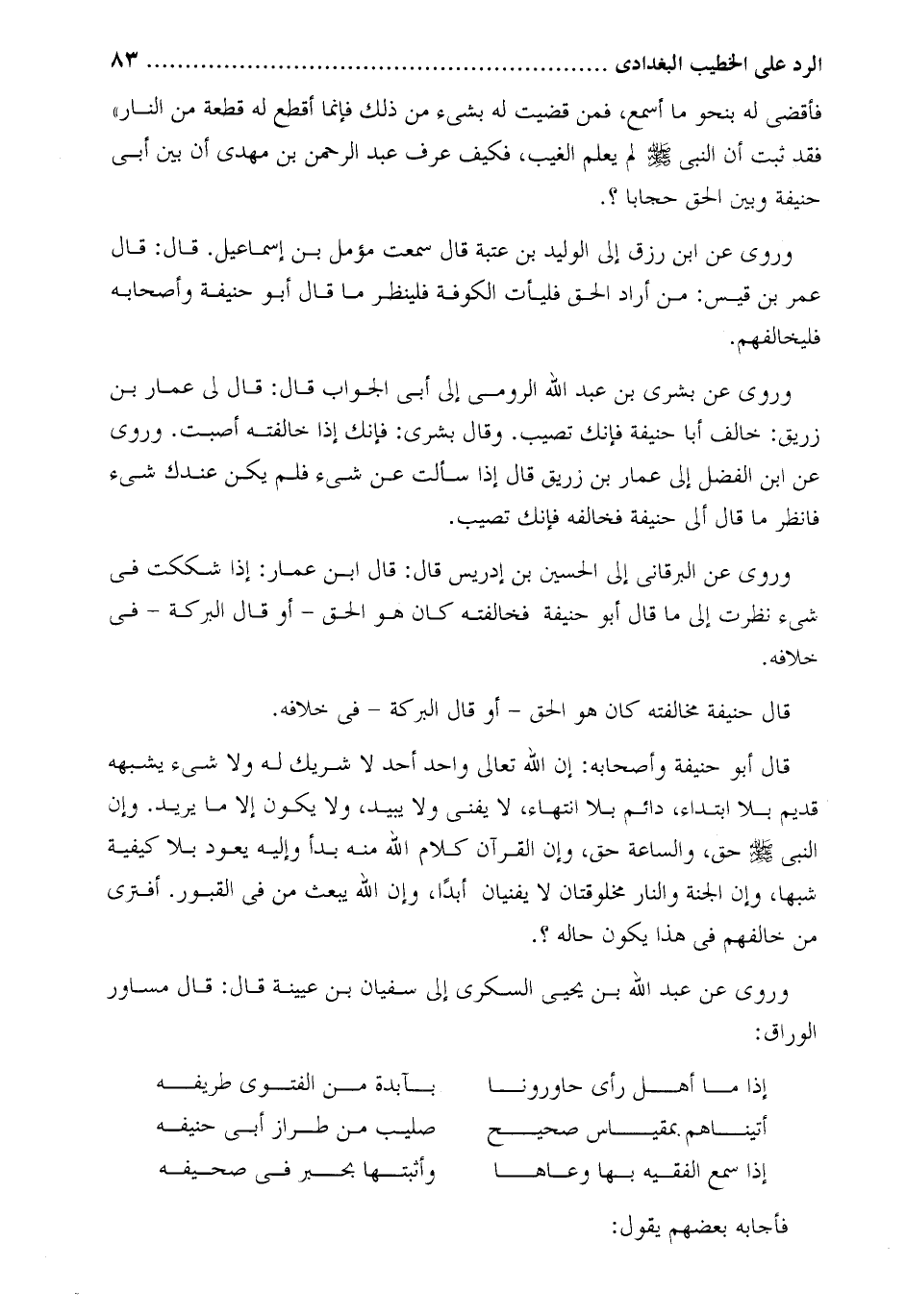فقد ثبت أَنَّ النَّبِيَّ صَلَّى اللَّهُ عَلَيْهِ وَسَلَّمَ لَمْ يعلم الغيب، فكيف عرف عبد الرحمن بن مهدى أن بين أبى حنيفة وبين الحق حجابا؟.