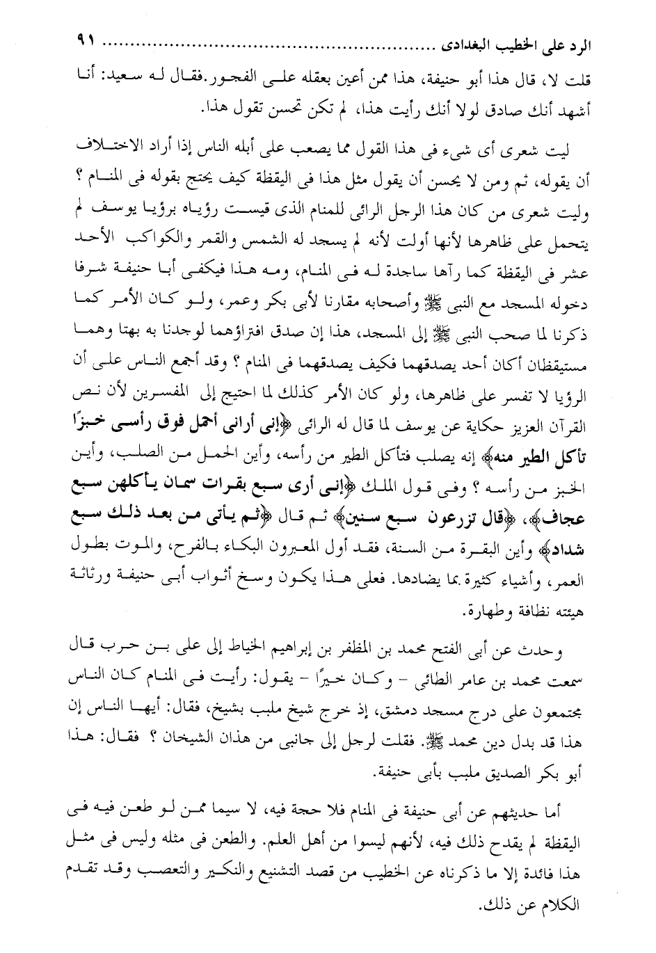 وليت شعري من كان هذا الرجل الرائي للمنام الذي قيست رؤياه برؤيا يوسف لم يتحمل على ظاهرها لأنها أولت لأنه لم يسجد له الشمس والقمر والكواكب الأحد عشر في اليقظة كما رآها ساجدة له في المنام، ومه هذا فيكفى أبا حنيفة شرفا دخوله المسجد مع النَّبِيّ صَلَّى اللَّهُ عَلَيْهِ وَسَلَّمَ وأصحابه مقارنا لأبى بكر وعمر، ولو كان الأمر كما ذكرنا لما صحب النبي صلّى الله عليه وسلّم إلى المسجد، هذا إن صدق افتراؤهما لوجدنا به بهتا وهما مستيقظان أكان أحد يصدقهما فكيف يصدقهما في المنام؟ وقد أجمع الناس على أن الرؤيا لا تفسر على ظاهرها، ولو كان الأمر كذلك لما احتيج إلى المفسرين لأن نص القرآن العزيز حكاية عن يوسف لما قال له الرائي إِنِّي أَرانِي أَحْمِلُ فَوْقَ رَأْسِي خُبْزاً تَأْكُلُ الطَّيْرُ مِنْهُ