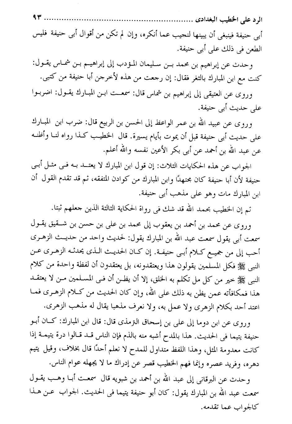 وحدث عن البرقاني إلى عَبْد الله بن أَحْمَد بن شَبُّويَه قَالَ سَمِعْتُ أَبَا وَهْب يَقُول سَمِعْتُ عَبْد اللَّهِ بْن المبارك يَقُول: كَانَ أَبُو حنيفة يتيما في الحديث. الجواب عن هذا كالجواب عما تقدمه.