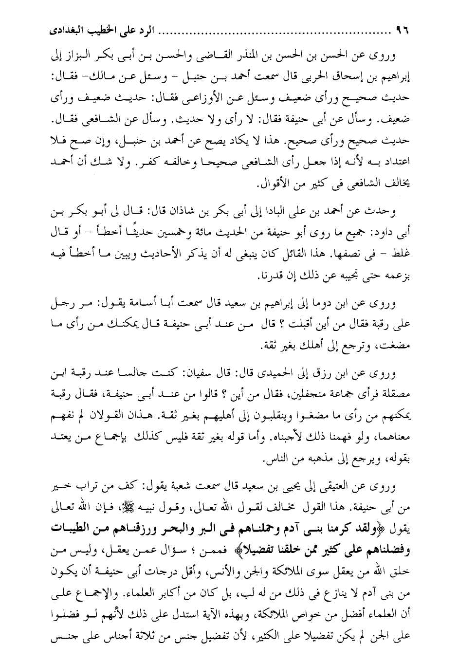 وروى عن العتيقى إلى يحيى بن سعيد قال سَمِعْتُ شُعْبَة يَقُولُ: كف من تراب خير من أبى حنيفة. هذا القول مخالف لقول الله تعالى، وقول نبيه صلّى الله عليه وسلّم، فإن الله تعالى يقول وَلَقَدْ كَرَّمْنا بَنِي آدَمَ وَحَمَلْناهُمْ فِي الْبَرِّ وَالْبَحْرِ وَرَزَقْناهُمْ مِنَ الطَّيِّباتِ وَفَضَّلْناهُمْ عَلى كَثِيرٍ مِمَّنْ خَلَقْنا تَفْضِيلًا