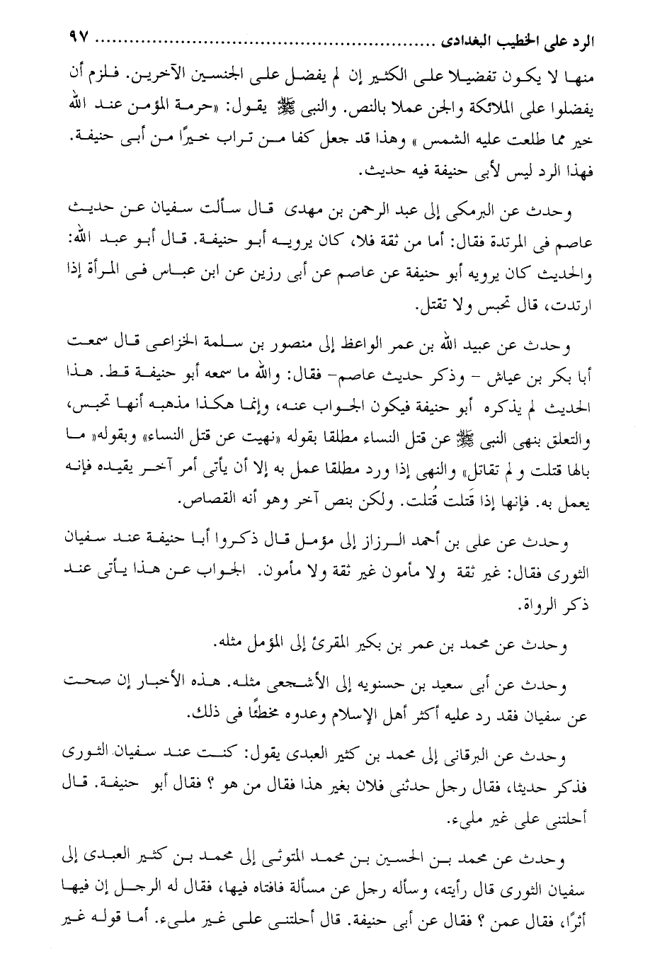 وحدث عن على بن أحمد الرزاز إلى مُؤَمِّل قَالَ ذكروا أَبَا حنيفة عند سُفْيَان الثوري فَقَالَ: غير ثقة ولا مأمون غير ثقة ولا مأمون. الجواب عن هذا يأتى عند ذكر الرواة.