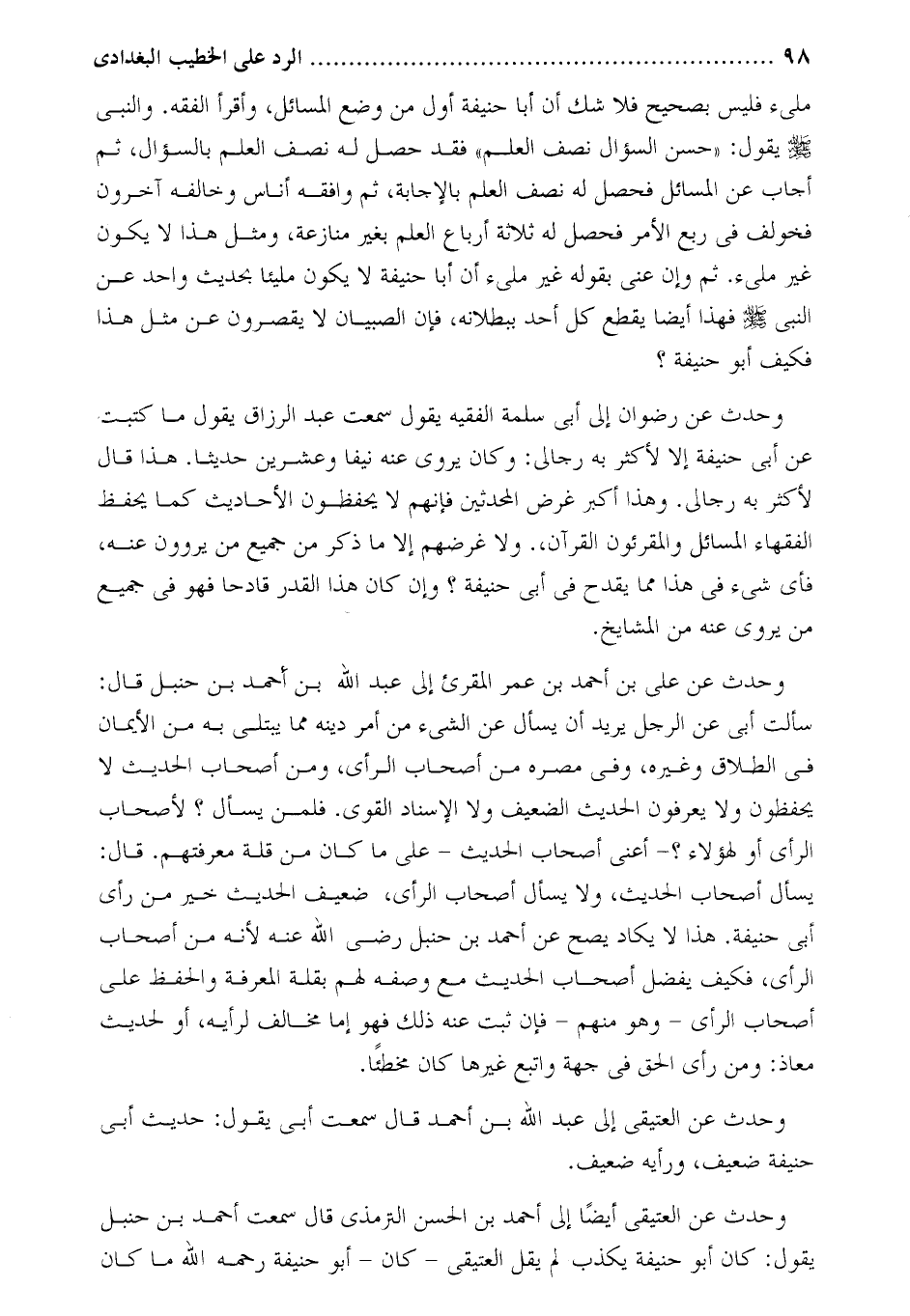 وحدث عن رضوان إلى أبى سلمة الفقيه يَقُولُ سَمِعْتُ عَبْد الرَّزَّاق يَقُولُ ما كتبت عن أَبِي حنيفة إِلا لأكثر بِهِ رجالي: وكان يروي عنه نَيِّفًا وعشرين حديثا. هذا قال لأكثر به رجالي. وهذا أكبر غرض المحدثين فإنهم لا يحفظون الأحاديث كما يحفظ الفقهاء المسائل والمقرءون القرآن،. ولا غرضهم إلا ما ذكر من جميع من يروون عنه، فأى شيء في هذا مما يقدح في أبى حنيفة؟ وإن كان هذا القدر قادحا فهو في جميع من يروى عنه من المشايخ.