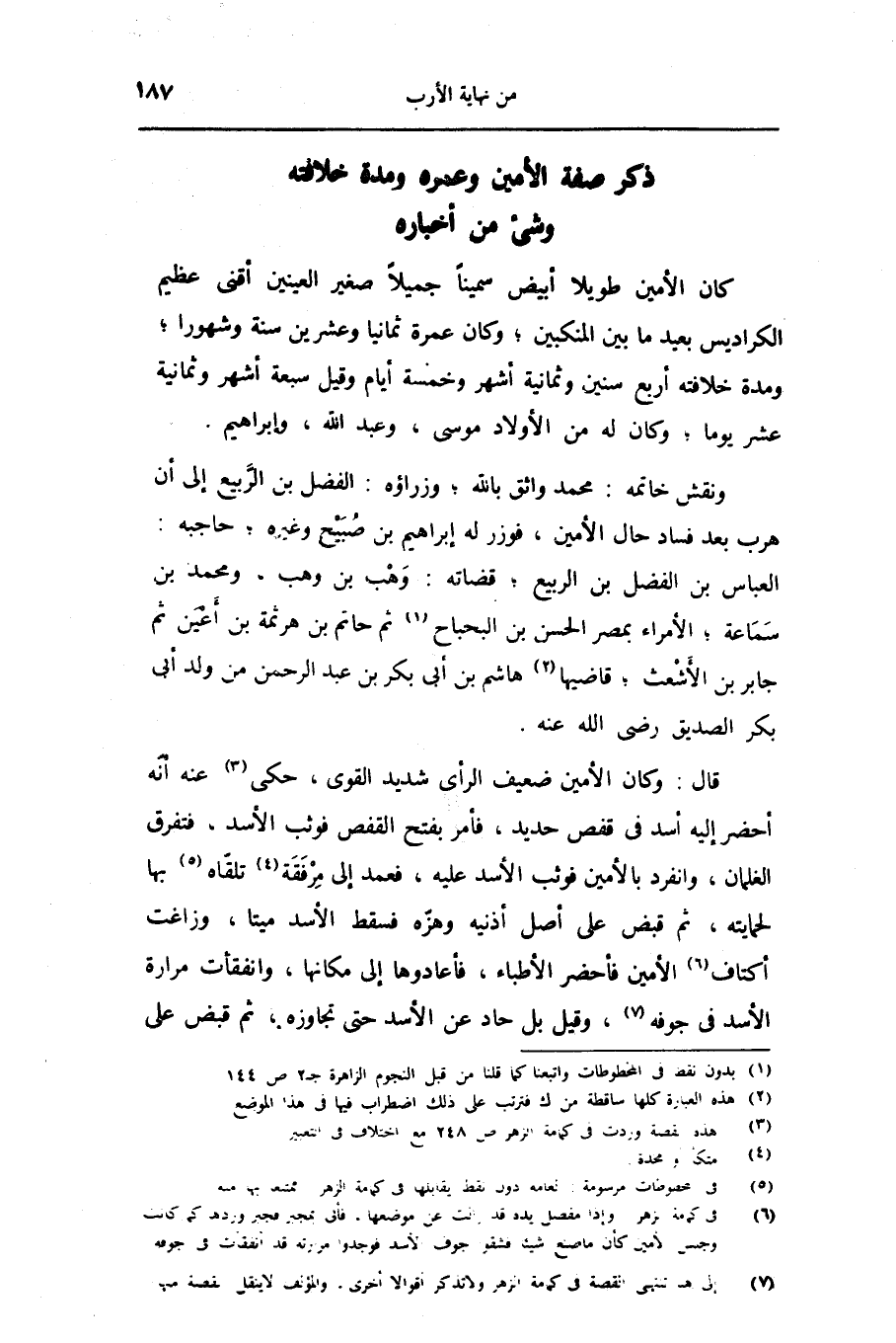 قال: وكان الأمين ضعيف الرأى شديد القوى، حكى «3» عنه أنّه أحضر إليه أسد فى قفص حديد، فأمر بفتح القفص فوثب الأسد، فتفرق الغلمان، وانفرد بالأمين فوثب الأسد عليه، فعمد إلى مرفقة «4» تلقّاه «5» بها لحمايته، ثم قبض على أصل أذنيه وهزّه فسقط الأسد ميتا، وزاغت أكتاف «6» الأمين فأحضر الأطباء، فأعادوها إلى مكانها، وانفقأت مرارة الأسد فى جوفه «7» ، وقيل بل حاد عن الأسد حتى تجاوزه، ثم قبض على