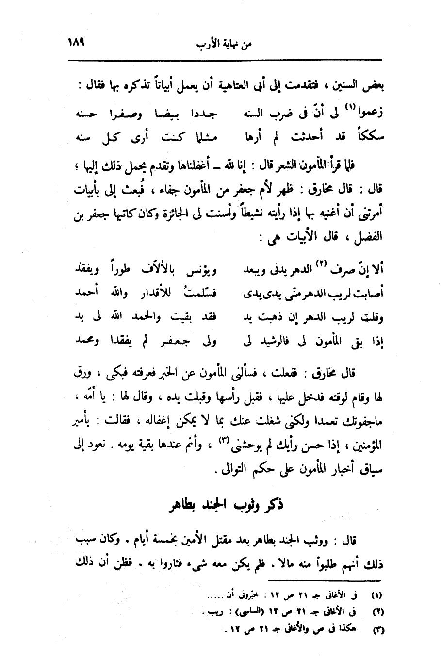 فلما قرأ المأمون الشعر قال: إنا لله- أغفلناها وتقدم يحمل ذلك إليها؛ قال: قال مخارق: ظهر لأم جعفر من المأمون جفاء، فبعث إلى بأبيات أمرتنى أن أغنيه بها إذا رأيته نشيطا وأسنت لى الجائزة وكان كاتبها جعفر بن الفضل، قال الأبيات هى: