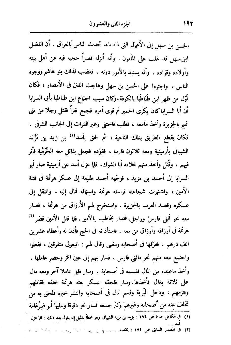 الحسن بن سهل إلى الأعمال التى ذكرناها تحدث الناس بالعراق، أن الفضل ابن سهل قد غلب على المأمون، وأنّه أنزله قصرا حجبه فيه عن أهل بيته وأولاده وقوّاده، وأنه يستبد بالأمور دونه، فغضب لذلك بنو هاشم ووجوه الناس، واجترءا على الحسن بن سهل وهاجت الفتن فى الأمصار، فكان أوّل من ظهر ابن طباطبا بالكوفة، وكان سبب اجتماع ابن طباطبا بأبى السرايا أن أبا السرايا كان يكرى الحمير ثم قوى أمره فجمع نفرا فقتل رجلا من بنى تميم بالجزيرة وأخذ ما معه، فطلب فاختفى وعبر الفرات إلى الجانب الشرقى، فكان يقطع الطريق بتلك الناحية، ثم لحق بأسد «1» بن زيد بن مزيد الشيبانى بأرمينية ومعه ثلاثون فارسا، فقوّده فجعل يقاتل معه الخرميّة فأثر فيهم، وقتل وأخذ منهم غلامه أبا الشوك، فلما عزل أسد عن أرمينية صار أبو السرايا إلى أحمد بن مزيد، فوجّه أحمد طليعة إلى عسكر هرثمة فى فتنة الأمين، واشتهرت شجاعته فراسله هرثمة واستماله فمال إليه، وانتقل إلى عسكره وقصد العرب بالجزيرة، واستخرج لهم الأرزاق من هرثمة، فصار معه نحو ألفى فارس وراجل، فصار يخاطب بالأمير، فلما قتل الأمين قصّر «2» هرثمة فى أرزاقه وأرزاق من معه، فاستأذنه فى الحج فأذن له وأعطاه عشرين الف درهم، ففرّقها فى أصحابه ومضى وقال لهم: اتبعونى متفرقين، ففعلوا واجتمع معه منهم نحو مائتى فارس، فسار بهم إلى عين التمر وحصر عاملها، وأخذ ما عنده من المال فقسمه فى أصحابة، وسار فلقى عاملا آخر ومعه مال على ثلاثة بغال فأخذها، وسار فلحقه عسكر بعثه هرثمة خلفه فقاتلهم وهزمهم، ودخل البرّية وقسم المال فى أصحابه وانتشر خبره فلحق به من تخلف عنه من أصحابه وغيرهم وكثر جمعه فسار نحو دقوقا وعليها أبو ضرغامة