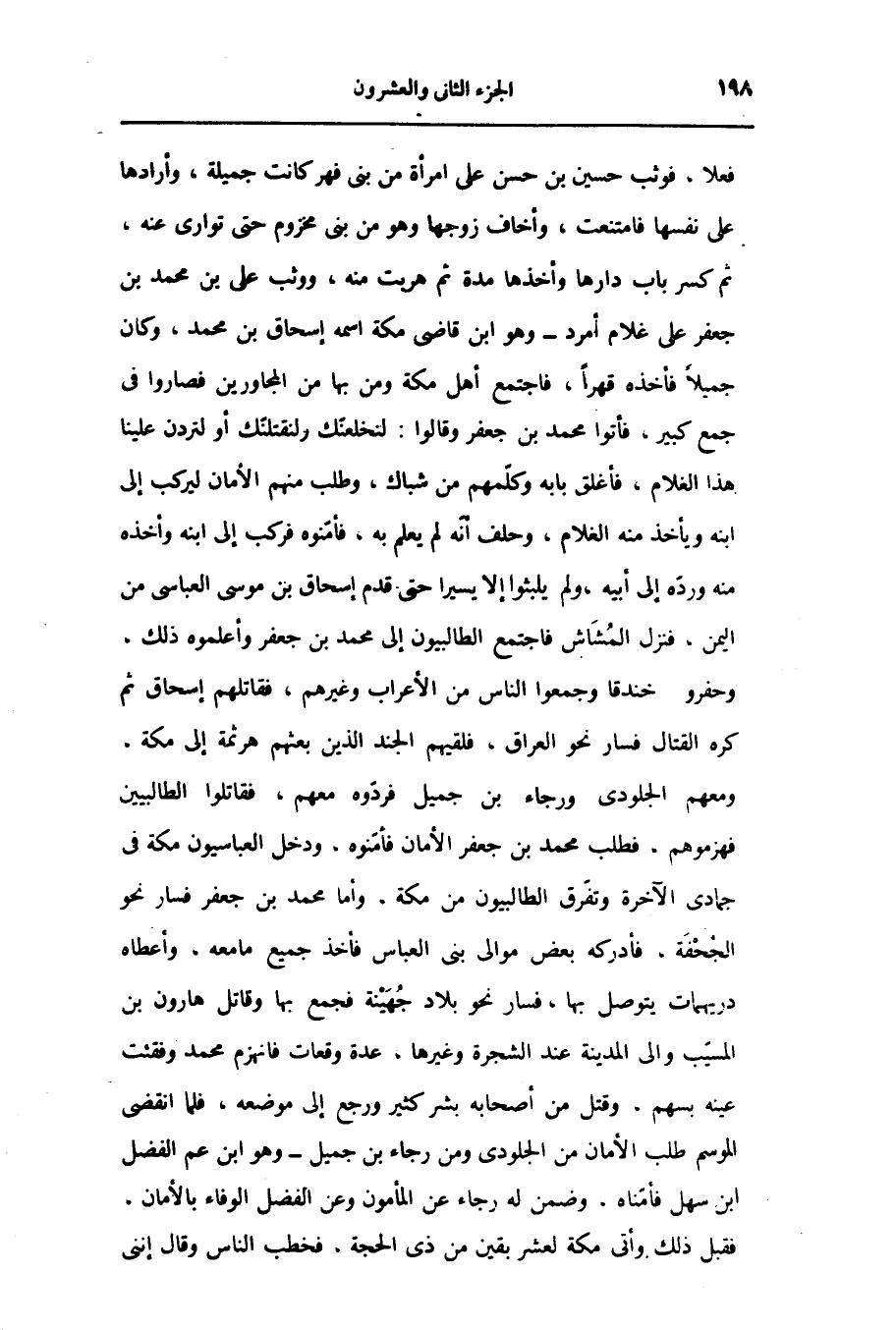 فعلا، فوثب حسين بن حسن على امرأة من بنى فهر كانت جميلة، وأرادها على نفسها فامتنعت، وأخاف زوجها وهو من بنى مخزوم حتى توارى عنه، ثم كسر باب دارها وأخذها مدة ثم هربت منه، ووثب على بن محمد بن جعفر على غلام أمرد- وهو ابن قاضى مكة اسمه إسحاق بن محمد، وكان جميلا فأخذه قهرا، فاجتمع أهل مكة ومن بها من المجاورين فصاروا فى جمع كبير، فأتوا محمد بن جعفر وقالوا: لنخلعنّك ولنقتلنّك أو لتردن علينا هذا الغلام، فأغلق بابه وكلّمهم من شباك، وطلب منهم الأمان ليركب إلى ابنه ويأخذ منه الغلام، وحلف أنّه لم يعلم به، فأمّنوه فركب إلى ابنه وأخذه منه وردّه إلى أبيه، ولم يلبثوا إلا يسيرا حتى قدم إسحاق بن موسى العباسى من اليمن، فنزل المشاش فاجتمع الطالبيون إلى محمد بن جعفر وأعلموه ذلك، وحفرو خندقا وجمعوا الناس من الأعراب وغيرهم، فقاتلهم إسحاق ثم كره القتال فسار نحو العراق، فلقيهم الجند الذين بعثهم هرثمة إلى مكة، ومعهم الجلودى ورجاء بن جميل فردّوه معهم، فقاتلوا الطالبيين فهزموهم، فطلب محمد بن جعفر الأمان فأمّنوه، ودخل العباسيون مكة فى جمادى الآخرة وتفّرق الطالبيون من مكة، وأما محمد بن جعفر فسار نحو الجحفة، فأدركه بعض موالى بنى العباس فأخذ جميع ما معه، وأعطاه دريهمات يتوصل بها، فسار نحو بلاد جهينة فجمع بها وقاتل هارون بن المسيّب والى المدينة عند الشجرة وغيرها، عدة وقعات فانهزم محمد وفقئت عينه بسهم، وقتل من أصحابه بشر كثير ورجع إلى موضعه، فلما انقضى الموسم طلب الأمان من الجلودى ومن رجاء بن جميل- وهو ابن عم الفضل ابن سهل فأمّناه، وضمن له رجاء عن المأمون وعن الفضل الوفاء بالأمان، فقبل ذلك وأتى مكة لعشر بقين من ذى الحجة، فخطب الناس وقال إننى