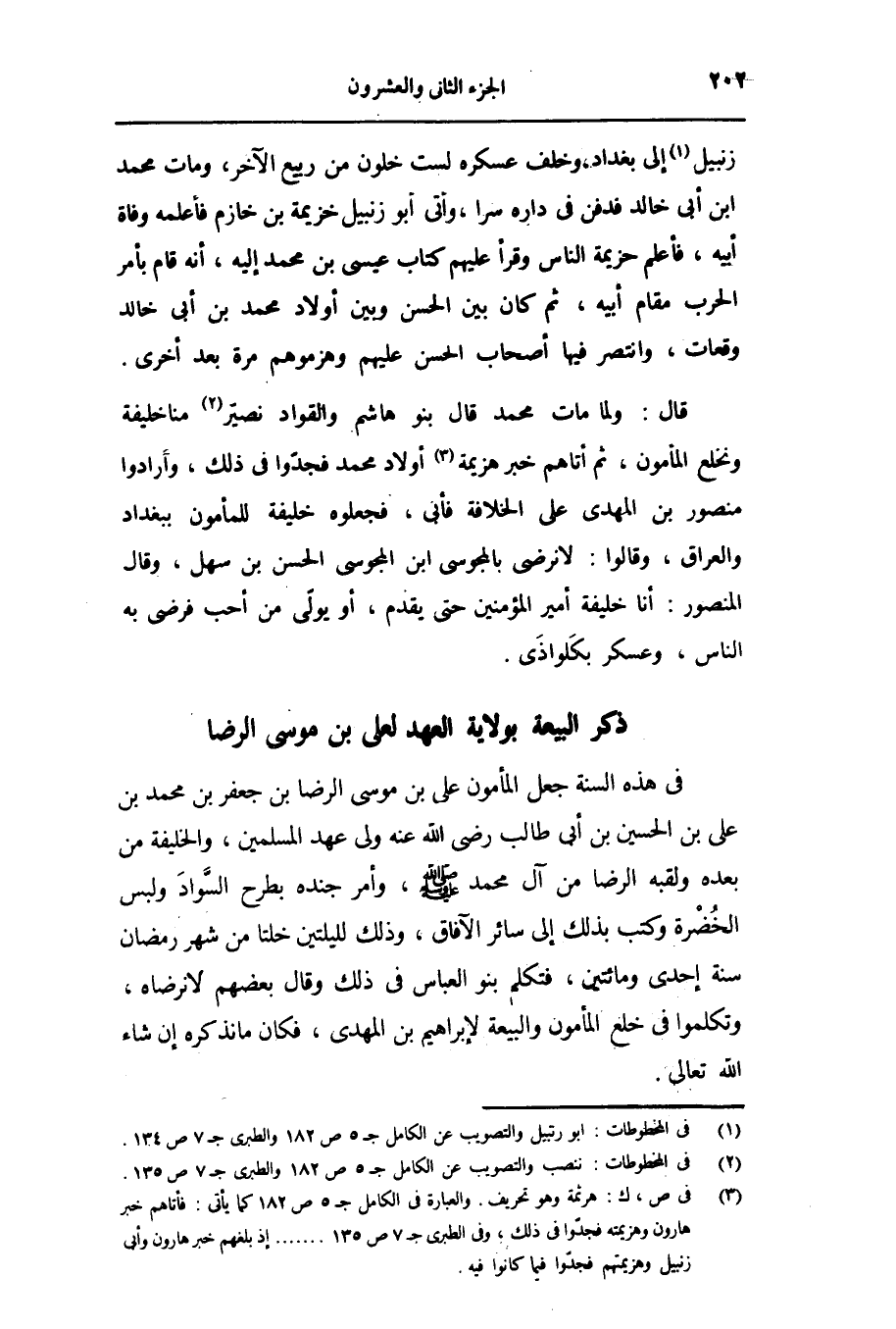 فى هذه السنة جعل المأمون على بن موسى الرضا بن جعفر بن محمد بن على بن الحسين بن أبى طالب رضى الله عنه ولى عهد المسلمين، والخليفة من بعده ولقبه الرضا من آل محمد صلّى الله عليه وسلّم، وأمر جنده بطرح السّواد ولبس الخضرة وكتب بذلك إلى سائر الآفاق، وذلك لليلتين خلتا من شهر رمضان سنة إحدى ومائتين، فتكلم بنو العباس فى ذلك وقال بعضهم لا نرضاه، وتكلموا فى خلع المأمون والبيعة لإبراهيم بن المهدى، فكان ما نذكره إن شاء الله تعالى.