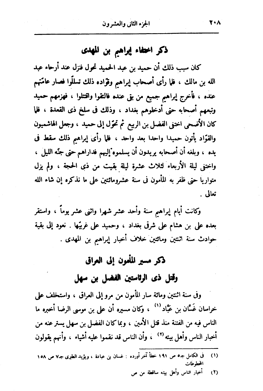 وكانت أيام إبراهيم سنة وأحد عشر شهرا واثنى عشر يوما، واستقر بعده على بن هشام على شرقى بغداد، وحميد على غربيّها. نعود إلى بقية حوادث سنة اثنتين ومائتين خلاف أخبار إبراهيم بن المهدى.