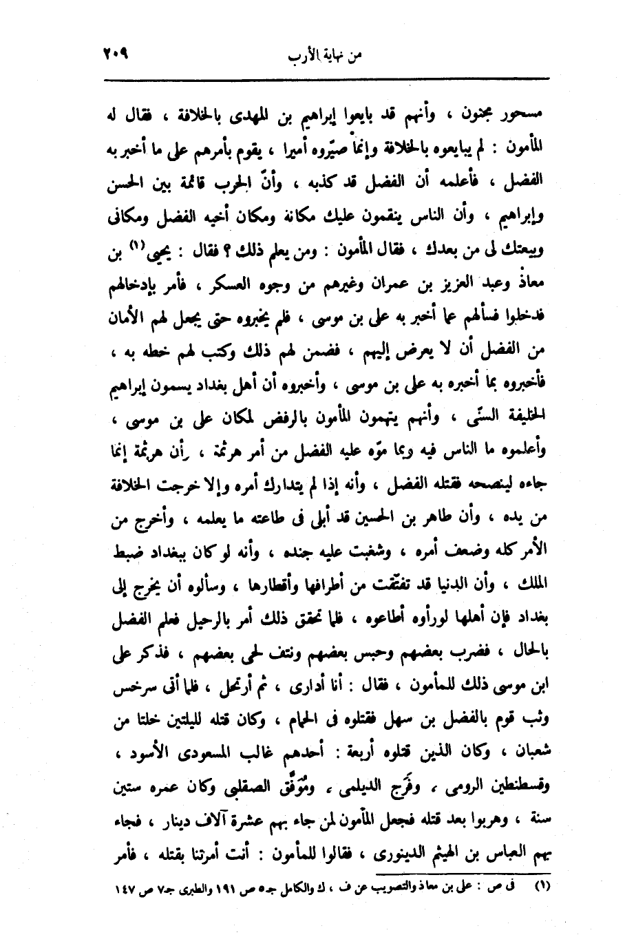 مسحور مجنون، وأنهم قد بايعوا إبراهيم بن المهدى بالخلافة، فقال له المأمون: لم يبايعوه بالخلافة وإنما صيّروه أميرا، يقوم بأمرهم على ما أخبر به الفضل، فأعلمه أن الفضل قد كذبه، وأنّ الحرب قائمة بين الحسن وإبراهيم، وأن الناس ينقمون عليك مكانه ومكان أخيه الفضل ومكانى وبيعتك لى من بعدك، فقال المأمون: ومن يعلم ذلك؟ فقال: يحيى «1» بن معاذ وعبد العزيز بن عمران وغيرهم من وجوه العسكر، فأمر بإدخالهم فدخلوا فسألهم عما أخبر به على بن موسى، فلم يخبروه حتى يجعل لهم الأمان من الفضل أن لا يعرض إليهم، فضمن لهم ذلك وكتب لهم خطه به، فأخبروه بما أخبره به على بن موسى، وأخبروه أن أهل بغداد يسمون إبراهيم الخليفة السنّى، وأنهم يتهمون المأمون بالرفض لمكان على بن موسى، وأعلموه ما الناس فيه وبما موّه عليه الفضل من أمر هرثمة، وأن هرثمة إنما جاءه لينصحه فقتله الفضل، وأنه إذا لم يتدارك أمره وإلا خرجت الخلافة من يده، وأن طاهر بن الحسين قد أبلى فى طاعته ما يعلمه، وأخرج من الأمر كله وضعف أمره، وشغبت عليه جنده، وأنه لو كان ببغداد ضبط الملك، وأن الدنيا قد تفتّقت من أطرافها وأقطارها، وسألوه أن يخرج إلى بغداد فإن أهلها لو رأوه أطاعوه، فلما تحقق ذلك أمر بالرحيل فعلم الفضل بالحال، فضرب بعضهم وحبس بعضهم ونتف لحى بعضهم، فذكر على ابن موسى ذلك للمأمون، فقال: أنا أدارى، ثم أرتحل، فلما أتى سرخس وثب قوم بالفضل بن سهل فقتلوه فى الحمام، وكان قتله لليلتين خلتا من شعبان، وكان الذين قتلوه أربعة: أحدهم غالب المسعودى الأسود، وقسطنطين الرومى، وفرج الديلمى، وموفّق الصقلبى وكان عمره ستين سنة، وهربوا بعد قتله فجعل المأمون لمن جاء بهم عشرة آلاف دينار، فجاء بهم العباس بن الهيثم الدينورى، فقالوا للمأمون: أنت أمرتنا بقتله، فأمر