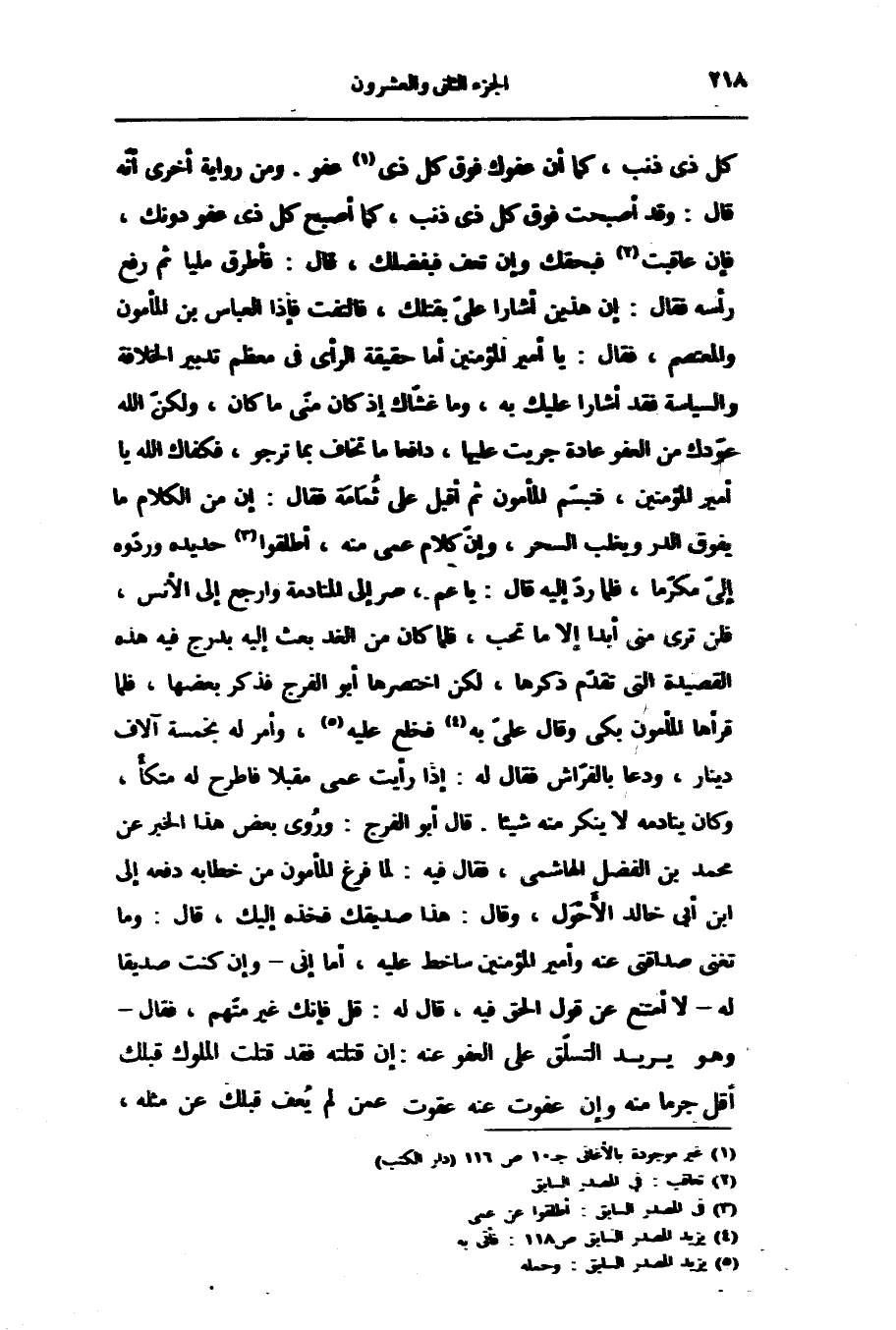 كل ذى ذنب، كما أن عفوك فوق كل ذى «1» عفو. ومن رواية أخرى أنّه قال: وقد أصبحت فوق كل ذى ذنب؛ كما أصبح كل ذى عفو دونك، فإن عاقبت «2» فبحقك وإن تعف فبفضلك، قال: فأطرق مليا ثم رفع رأسه فقال: إن هذين أشارا علىّ بقتلك، فالتفت فإذا العباس بن المأمون والمعتصم، فقال: يا أمير المؤمنين أما حقيقة الرأى فى معظم تدبير الخلافة والسياسة فقد أشارا عليك به، وما غشّاك إذ كان منّى ما كان، ولكنّ الله عوّدك من العفو عادة جريت عليها، دافعا ما تخاف بما ترجو، فكفاك الله يا أمير المؤمنين، فتبسّم المأمون ثم أقبل على ثمامة فقال: إن من الكلام ما يفوق الدر ويغلب السحر، وإنّ كلام عمى منه، أطلقوا «3» حديده وردّوه إلىّ مكرّما، فلما ردّ إليه قال: يا عم، صر إلى المنادمة وارجع إلى الأنس، فلن ترى منى أبدا إلا ما تحب، فلما كان من الغد بعث إليه بدرج فيه هذه القصيدة التى تقدّم ذكرها، لكن اختصرها أبو الفرج فذكر بعضها، فلما قرأها المأمون بكى وقال علىّ به «4» فخلع عليه «5» ، وأمر له بخمسة آلاف دينار، ودعا بالفرّاش فقال له: إذا رأيت عمى مقبلا فاطرح له متكأ، وكان ينادمه لا ينكر منه شيئا. قال أبو الفرج: وروى بعض هذا الخبر عن محمد بن الفضل الهاشمى، فقال فيه: لما فرغ المأمون من خطابه دفعه إلى ابن أبى خالد الأحول، وقال: هذا صديقك فخذه إليك، قال: وما تغنى صداقتى عنه وأمير المؤمنين ساخط عليه، أما إنى- وإن كنت صديقا له- لا أمتنع عن قول الحق فيه، قال له: قل فإنك غير متّهم، فقال- وهو يريد التسلّق على العفو عنه: إن قتلته فقد قتلت الملوك قبلك أقل جرما منه وإن عفوت عنه عقوت عمن لم يعف قبلك عن مثله،
